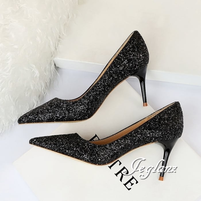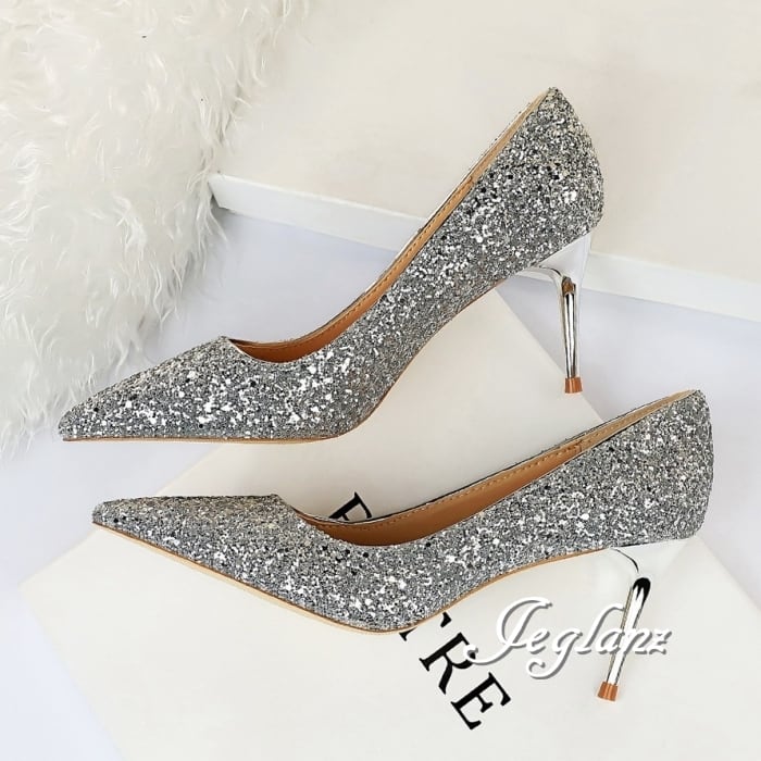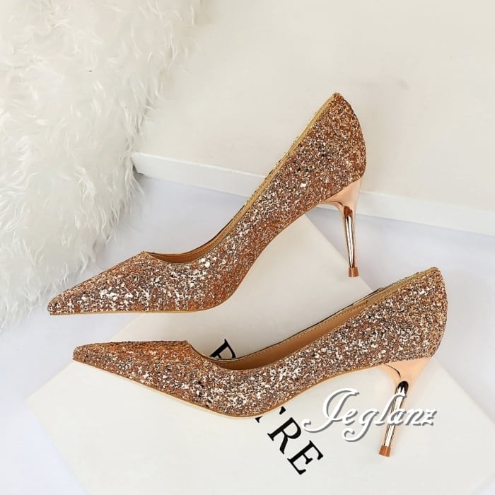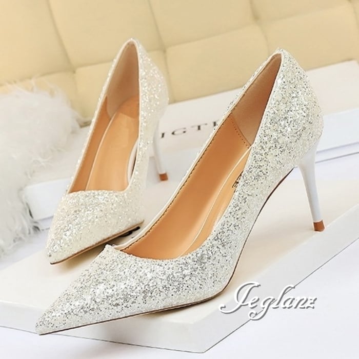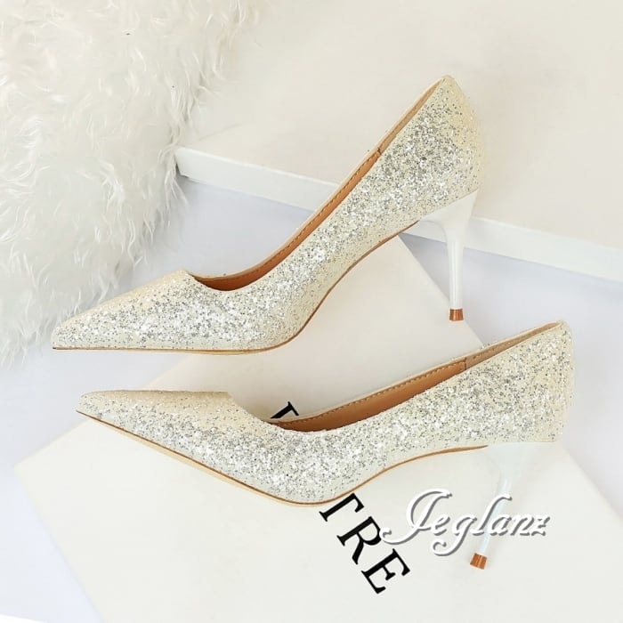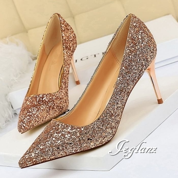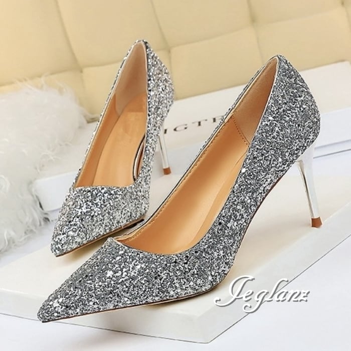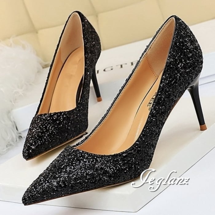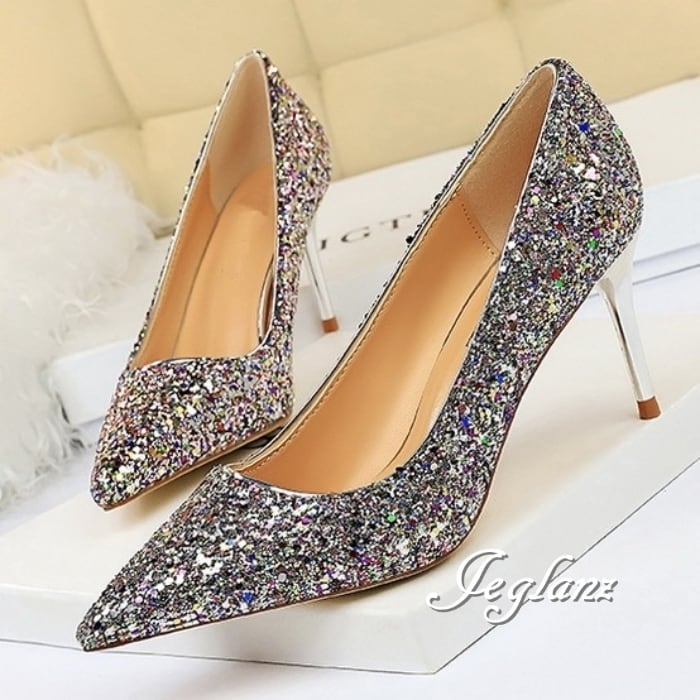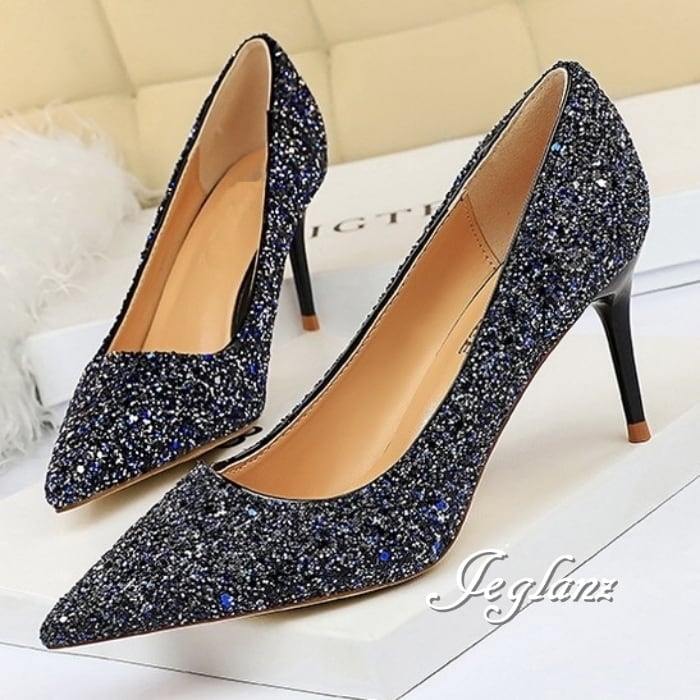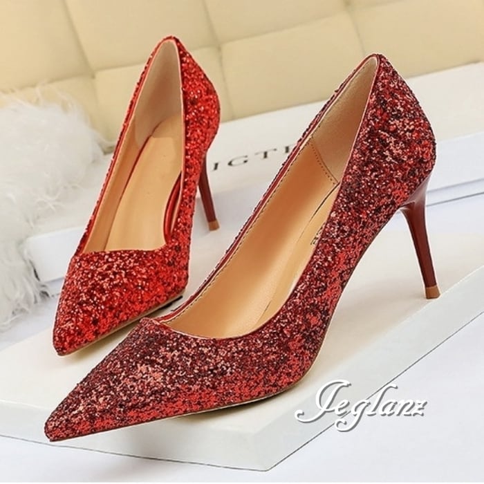 7色 パーティ パンプス ヒール ポインテッドトゥ キラキラ 光沢感(MB114)χ