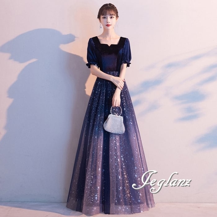 ベルベット調の光沢が美しいイブニングドレス