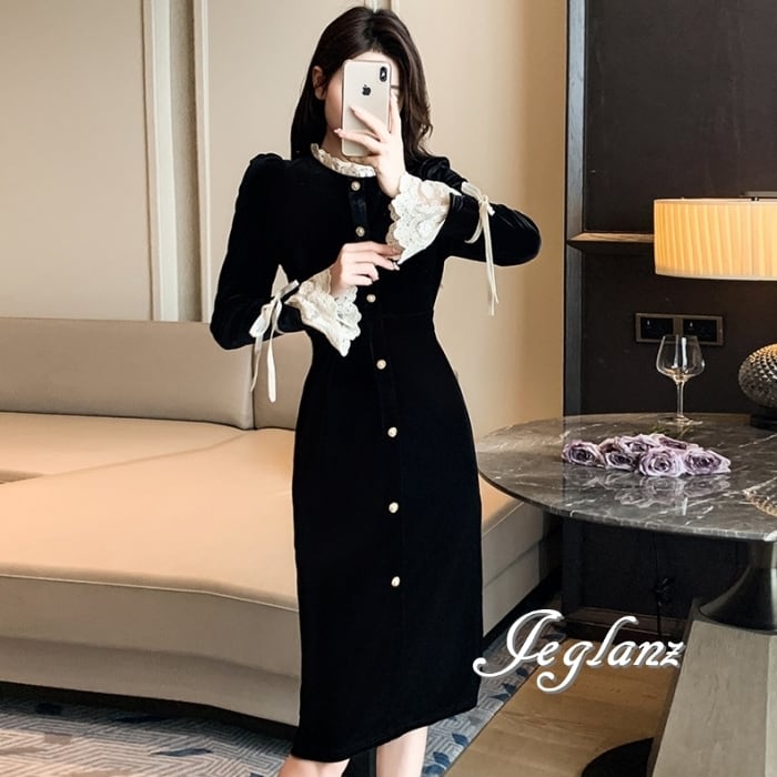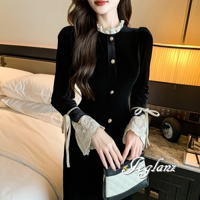 ベルベット調 パーティ バイカラー ワンピース ドレス レース 光沢感 (MB145)η