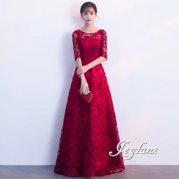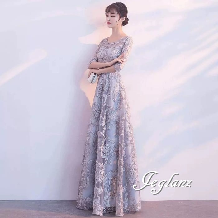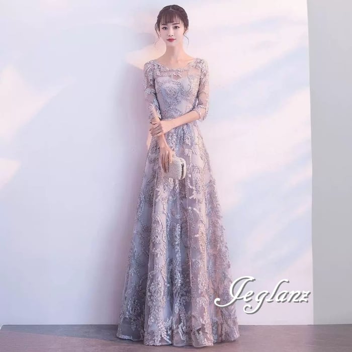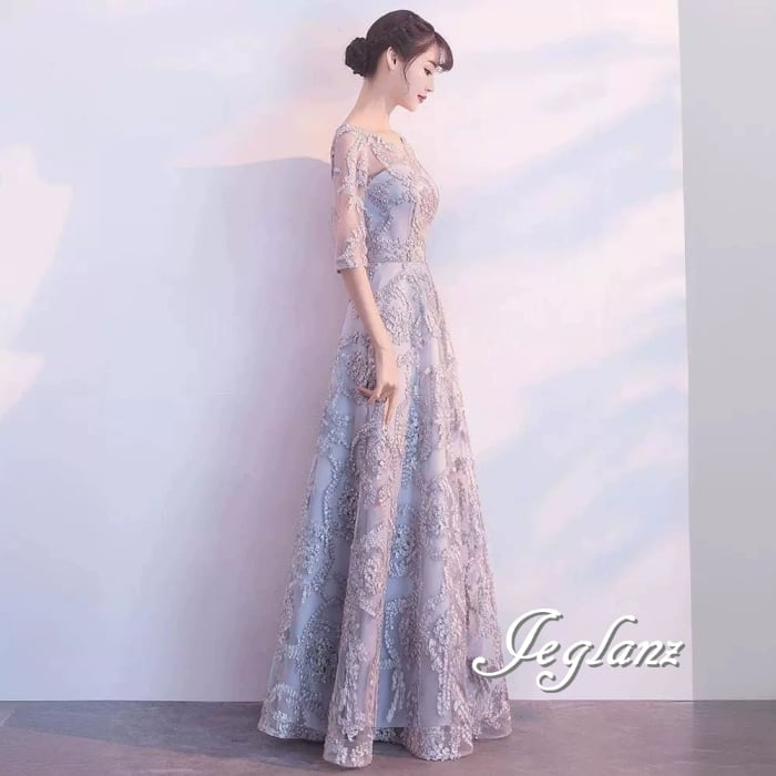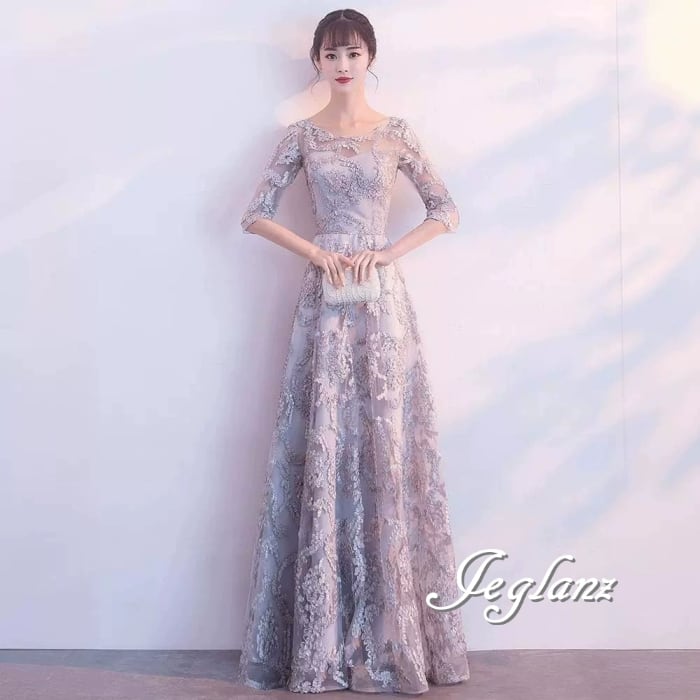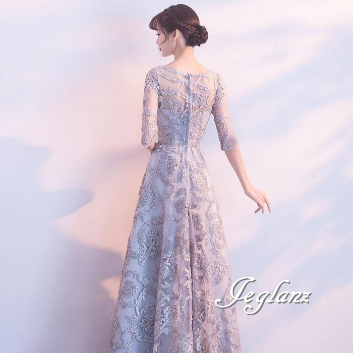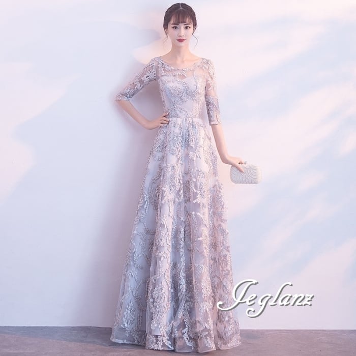2色 イブニングドレス 肌透け レース 刺繍 シアー 7分袖 上品 ♪ (MB153)ζ☆