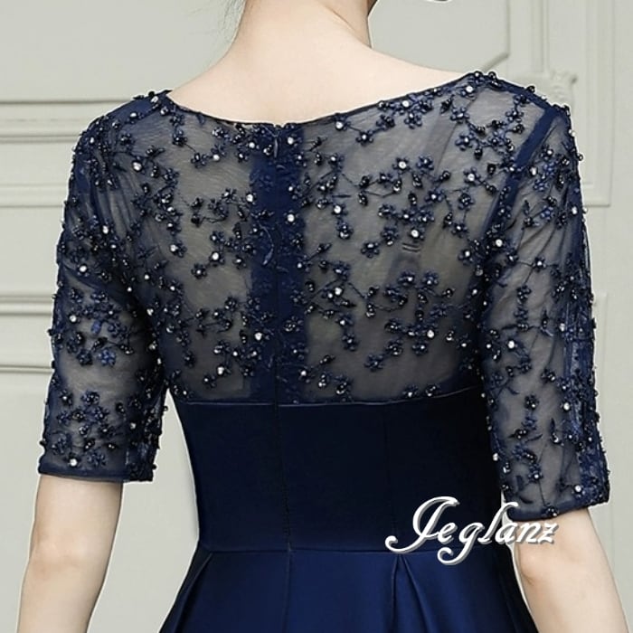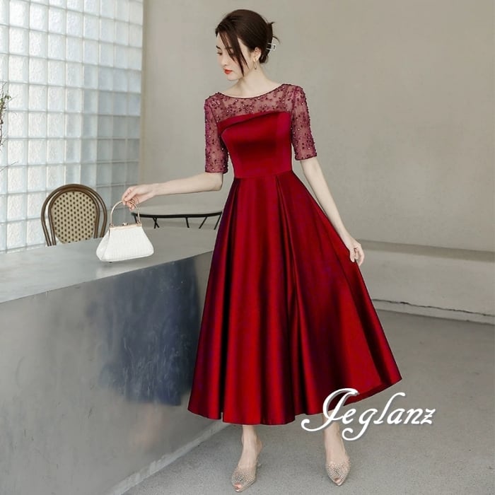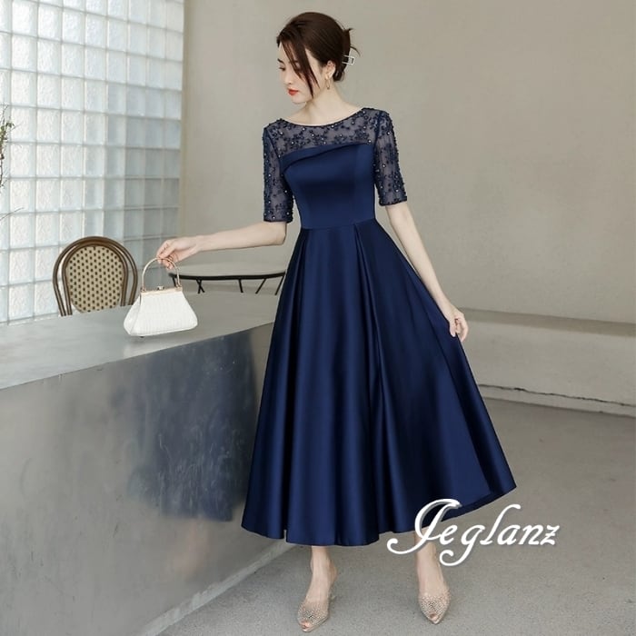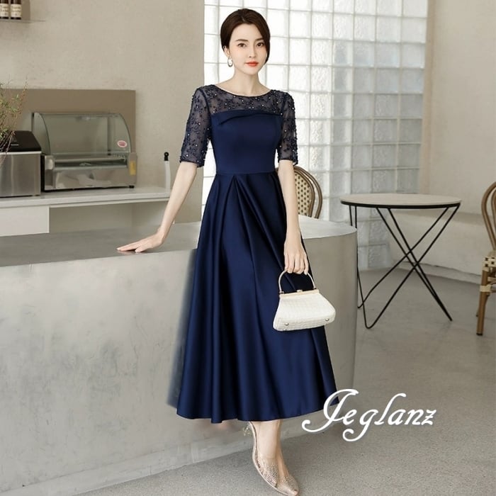 3色 パーティ ドレス ワンピース ラインストーン 光沢 肌透け 5分袖(MB154)ζ