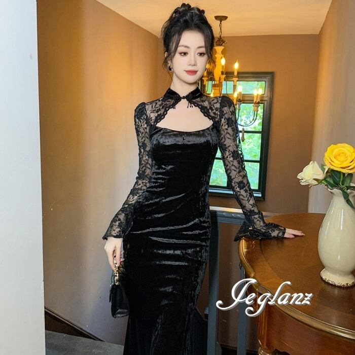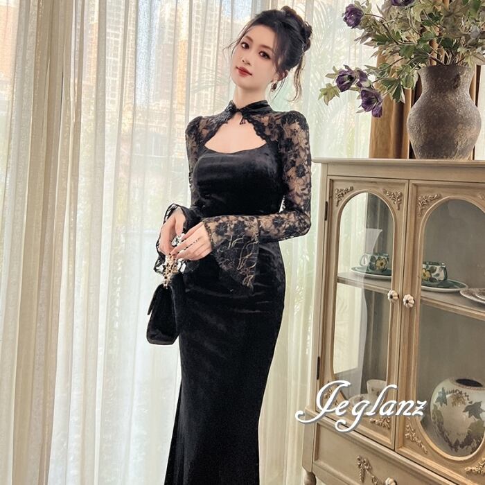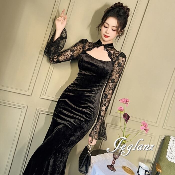 ベロア調の光沢が美しいイブニングドレス