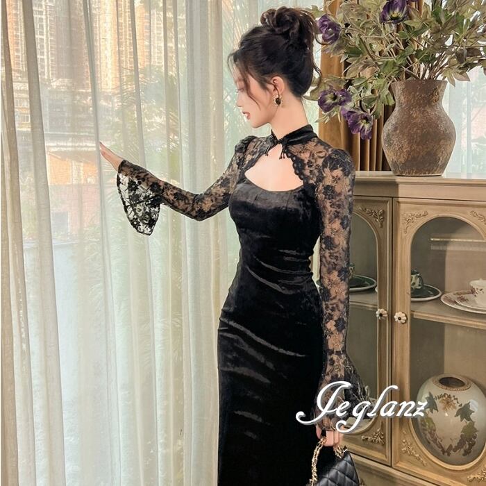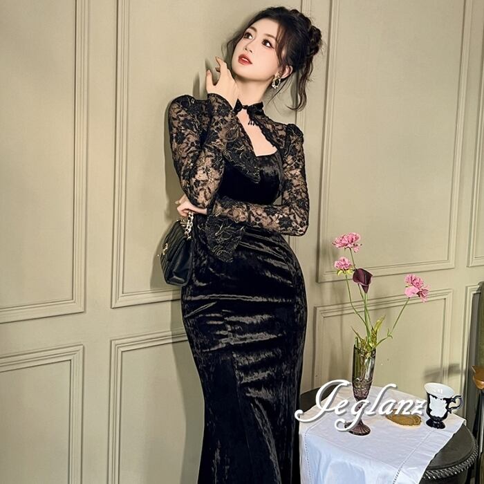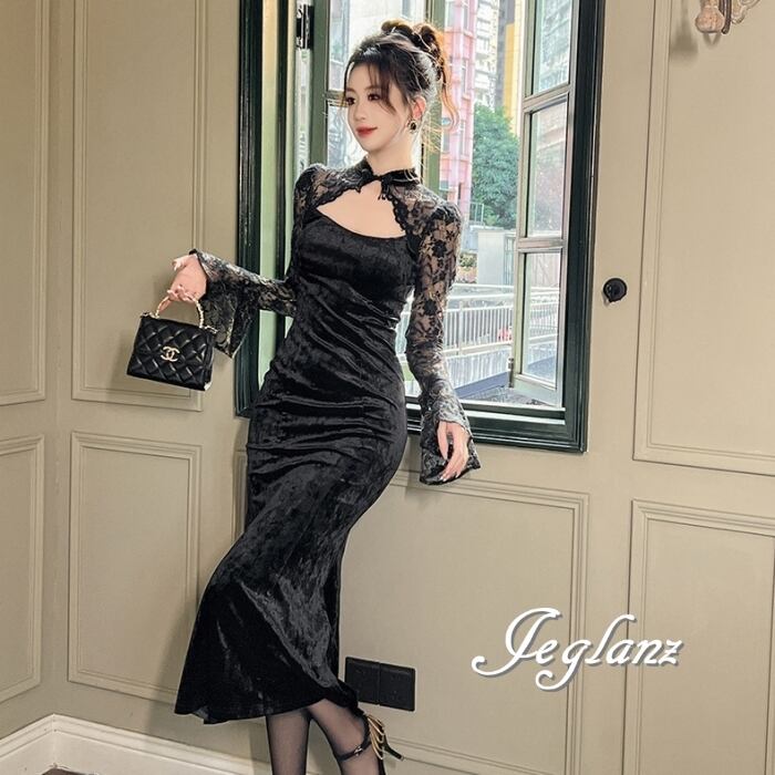 2色 パーティ ドレス ワンピース ベロア調 刺繍 レース 光沢感 (MB175)η