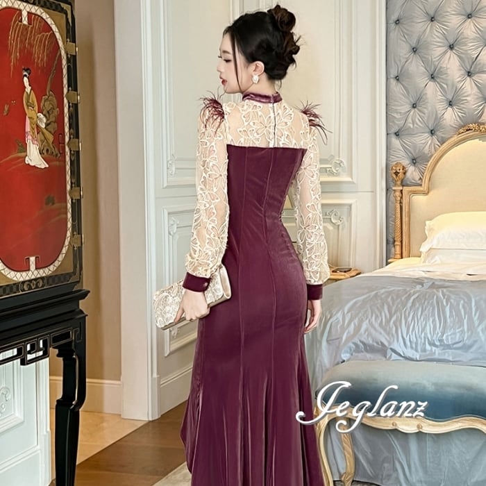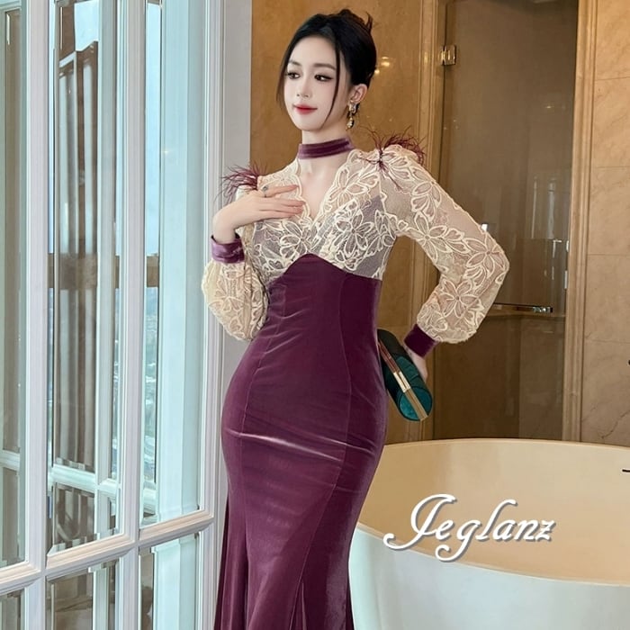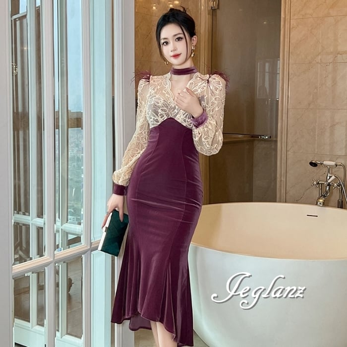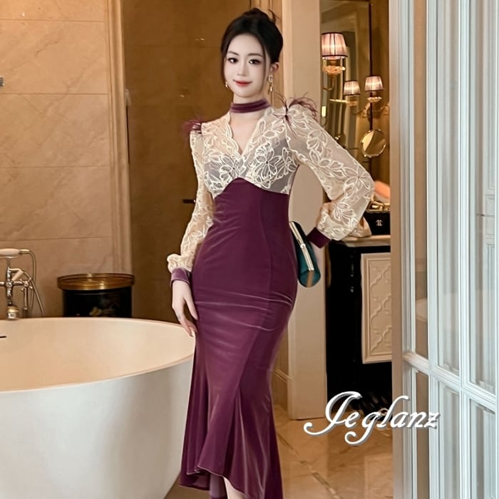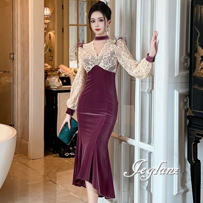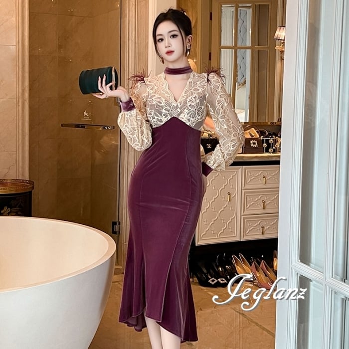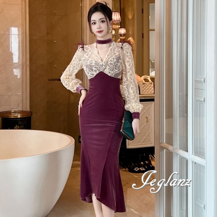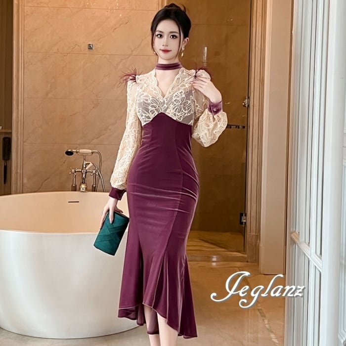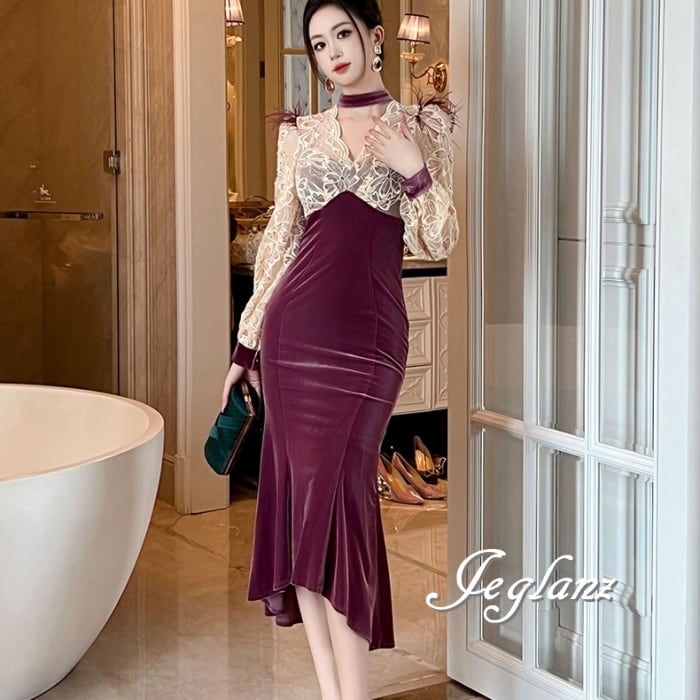パーティ ドレス バイカラー ワンピース ベロア調 レース フェザー ♪(MB182)η