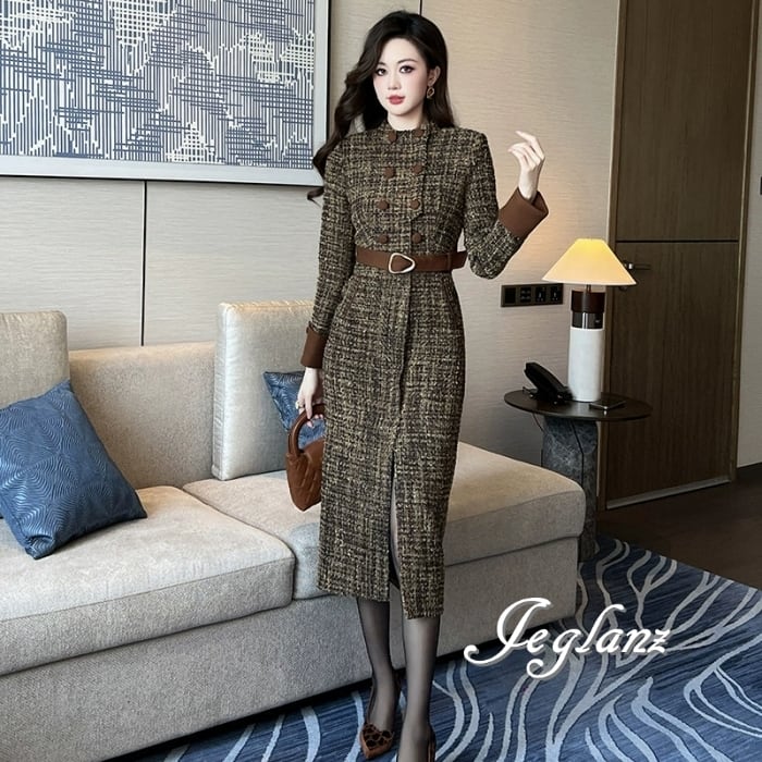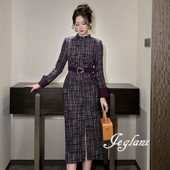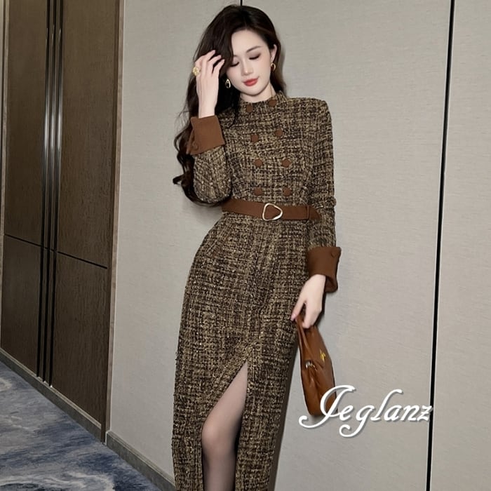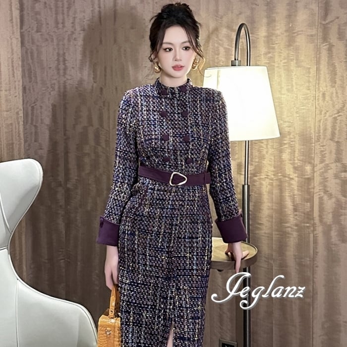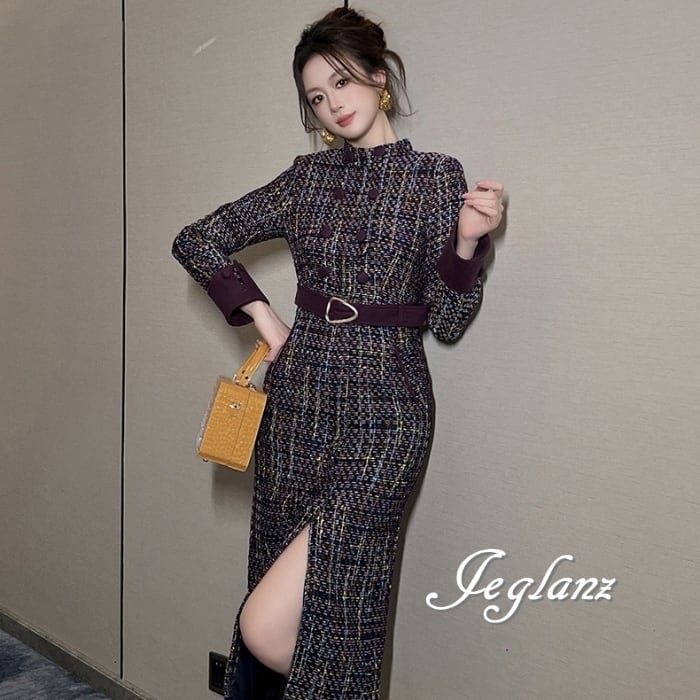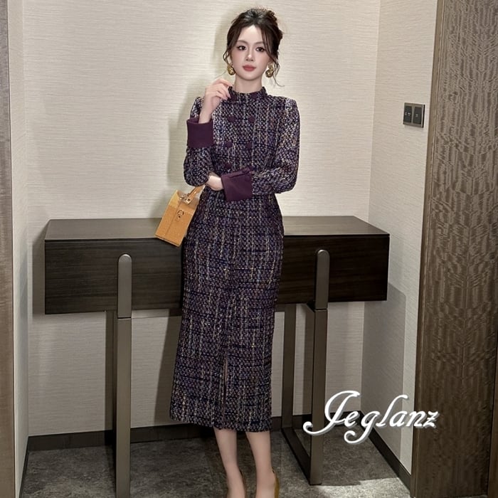 2色 ツイード ニット ワンピース スリット入り 光沢 ファンシー(MB232)η
