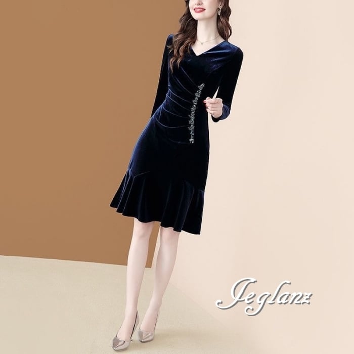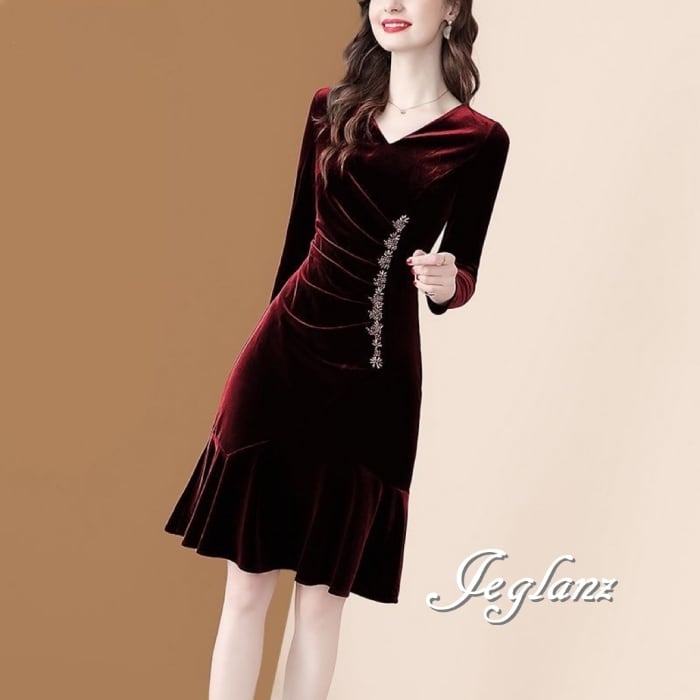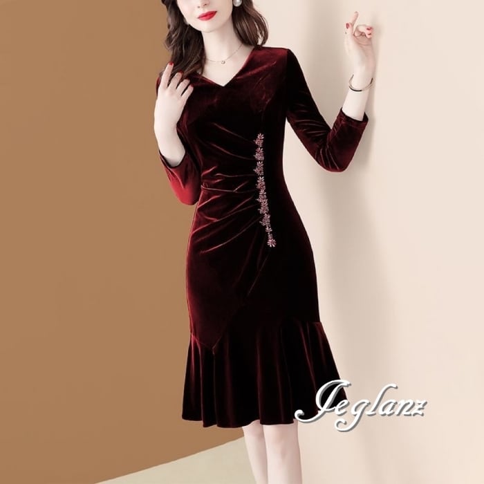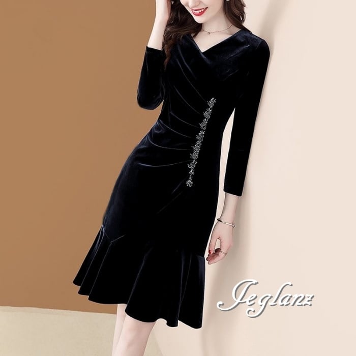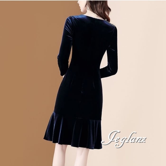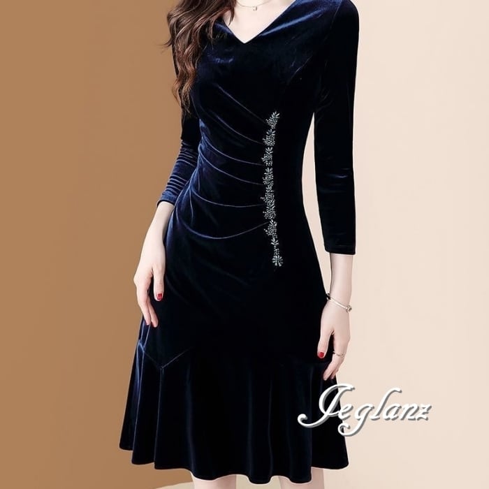 3色 ベルベット調 ワンピース ドレス ビジュー付き 7分袖 光沢感(MB265) η