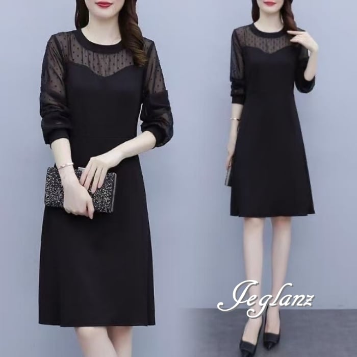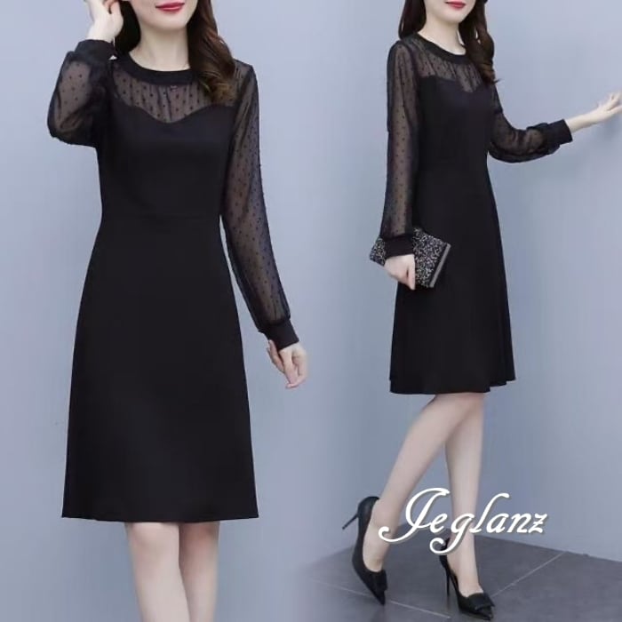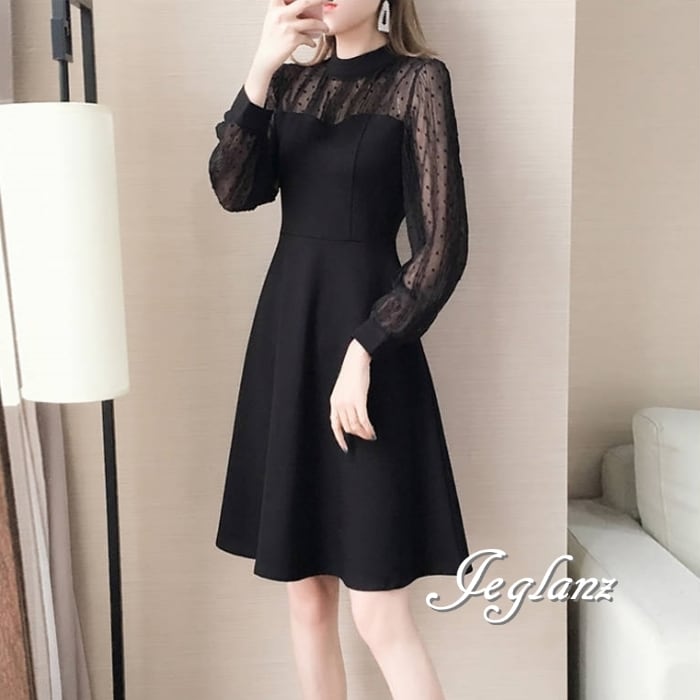 上品 セミフォーマル ブラックドレス 長袖 シアー 水玉 ドット(MB272)ζ