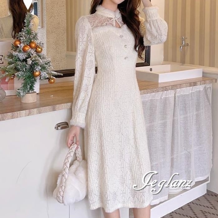 透かしレース&フェザーを合わせたワンピースドレス