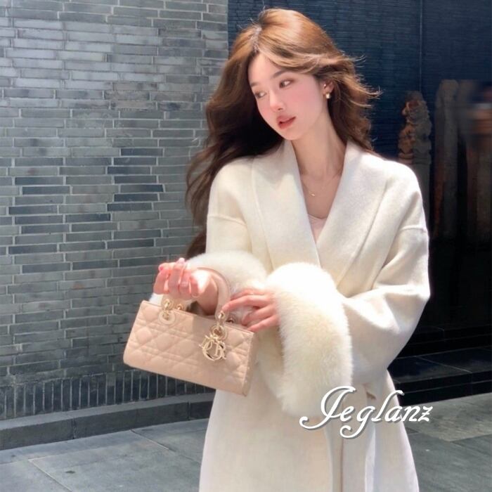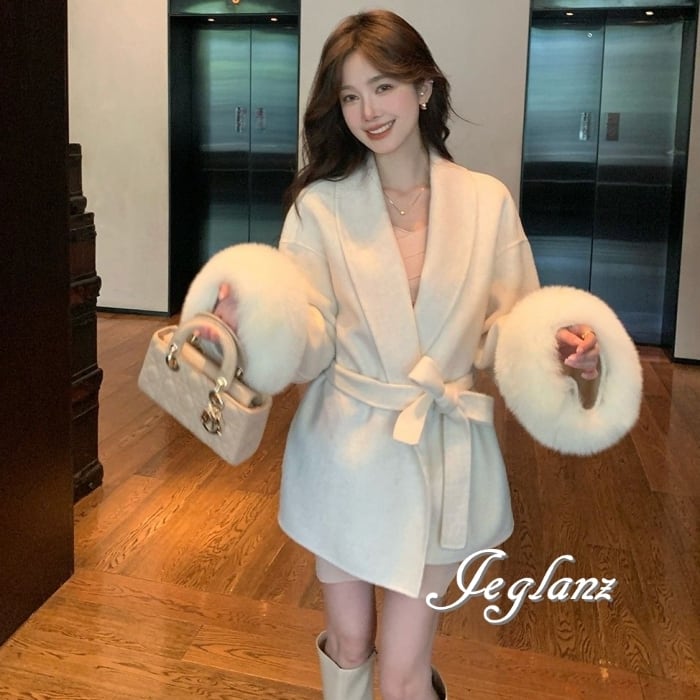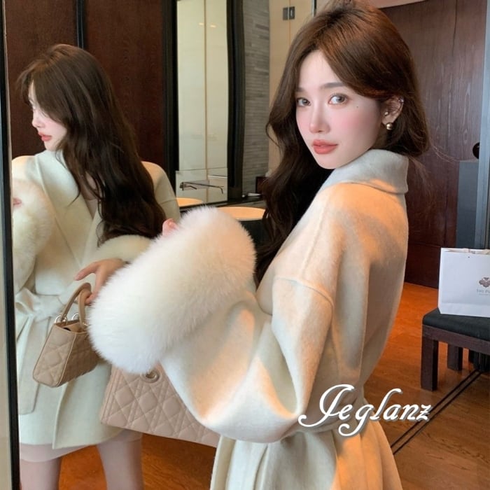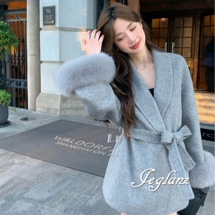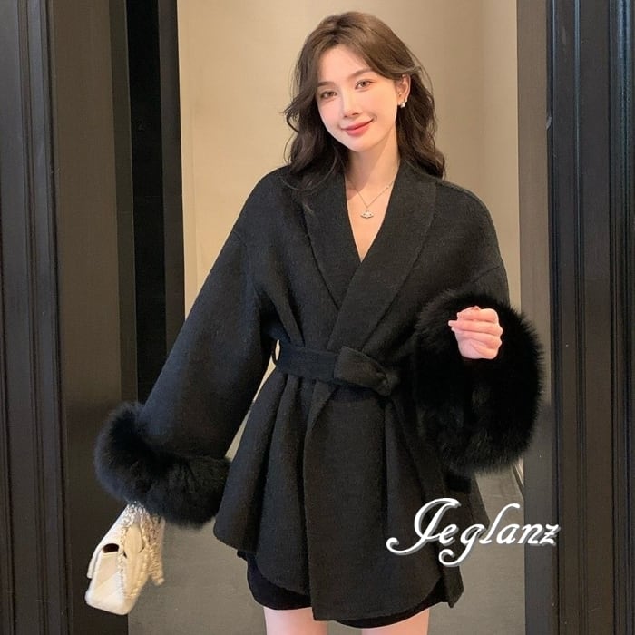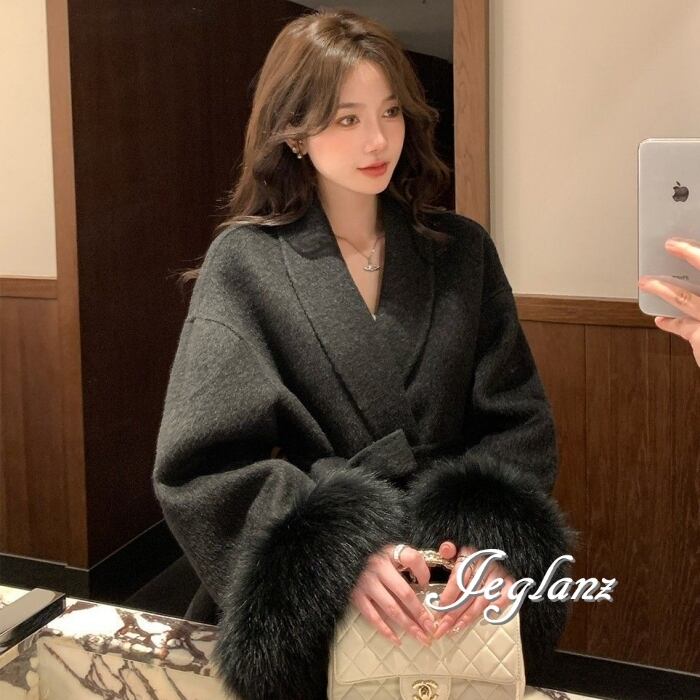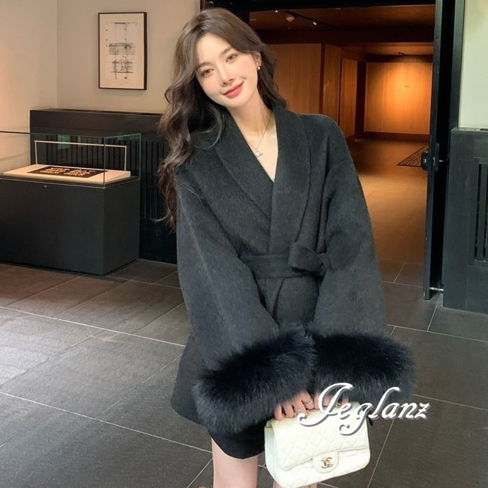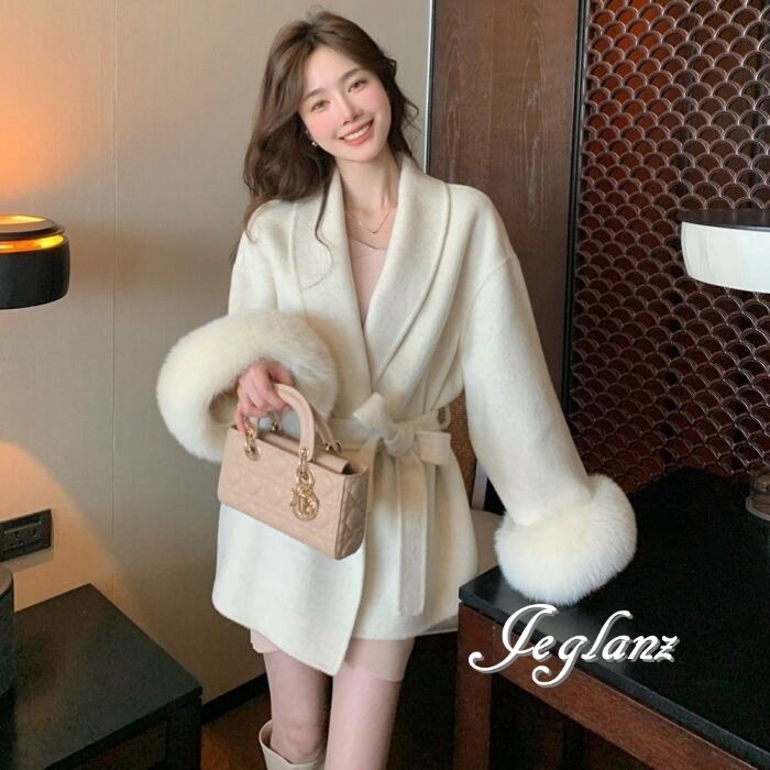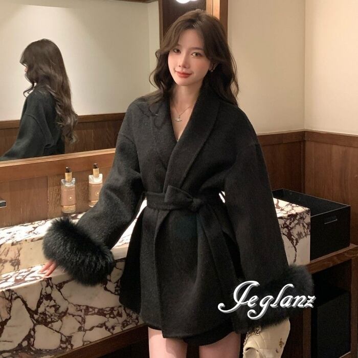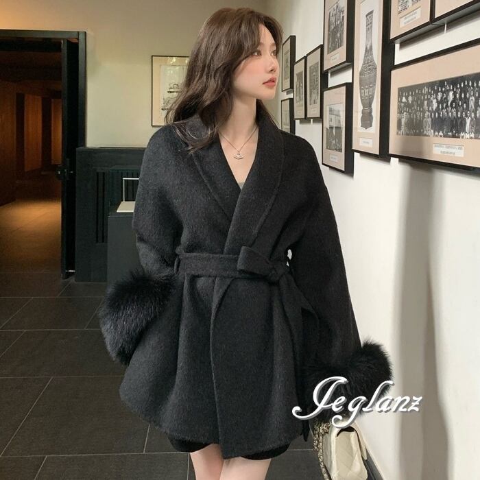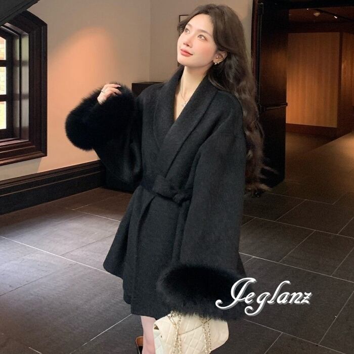 ハーフ丈 ニット コート 襟付き ボリュームファー 共ベルト 3色(MB283)τ