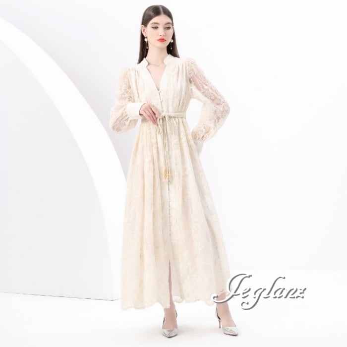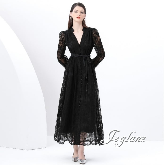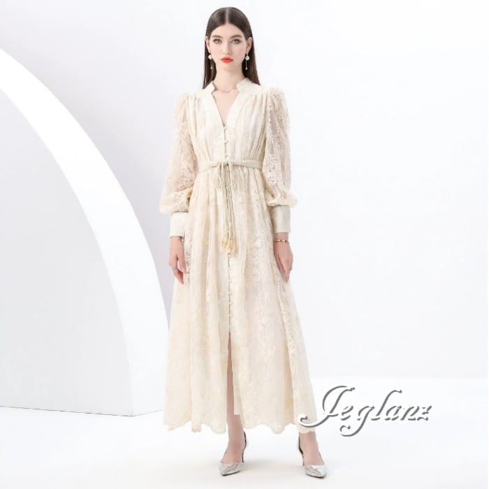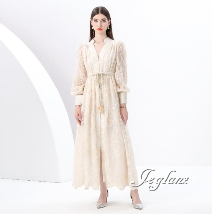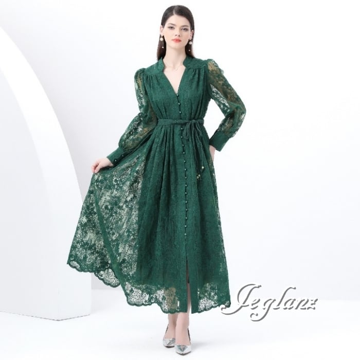 5色 レース 刺繍 ワンピース ボタン 共ベルト ファンシー(MB324)ε