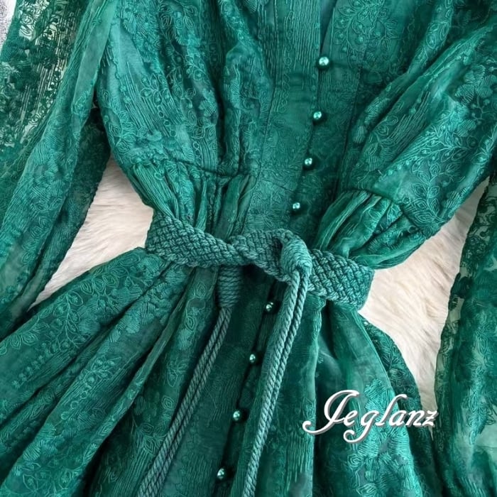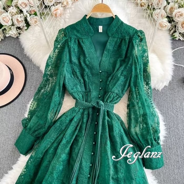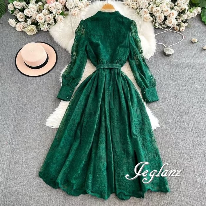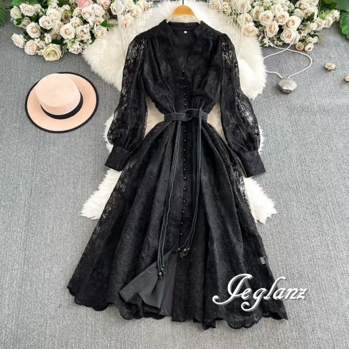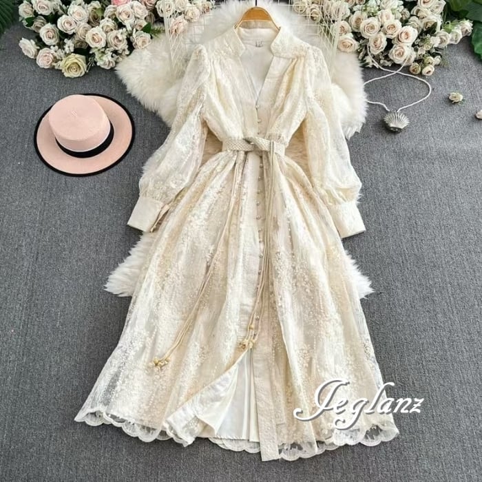 3色 レース 刺繍 ワンピース ボタン 共ベルト エターナル(MB325) ζ