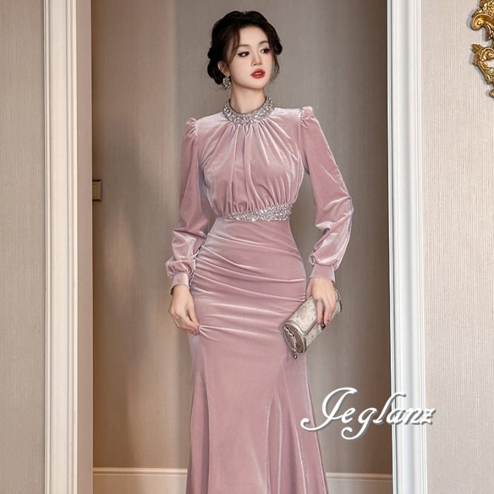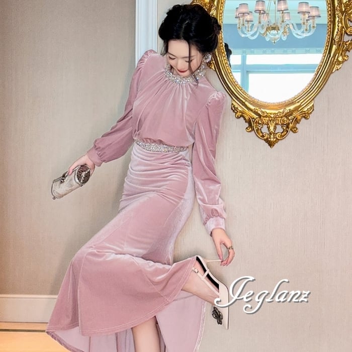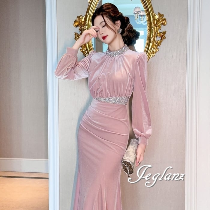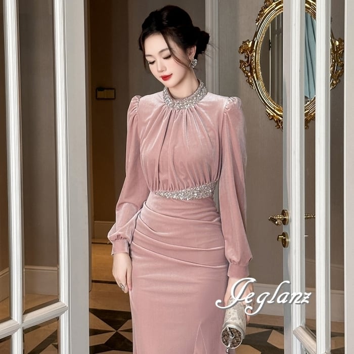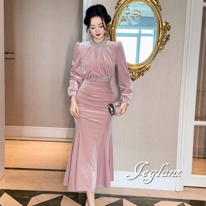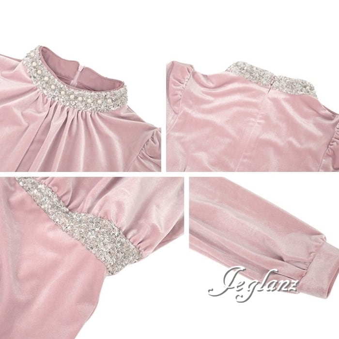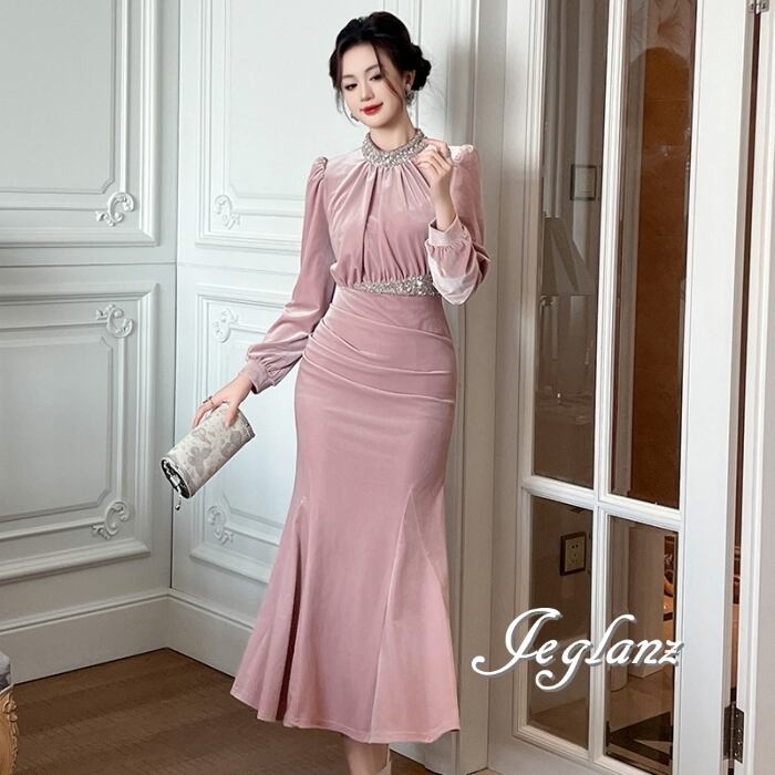 ベルベット調 パーティ ワンピース ドレス ビジュー 高見え(MB434)ζ☆