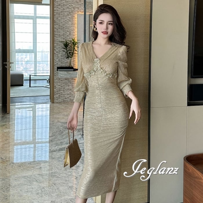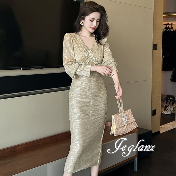 凹凸感のある素材に細やかなシワ模様を配したドレス