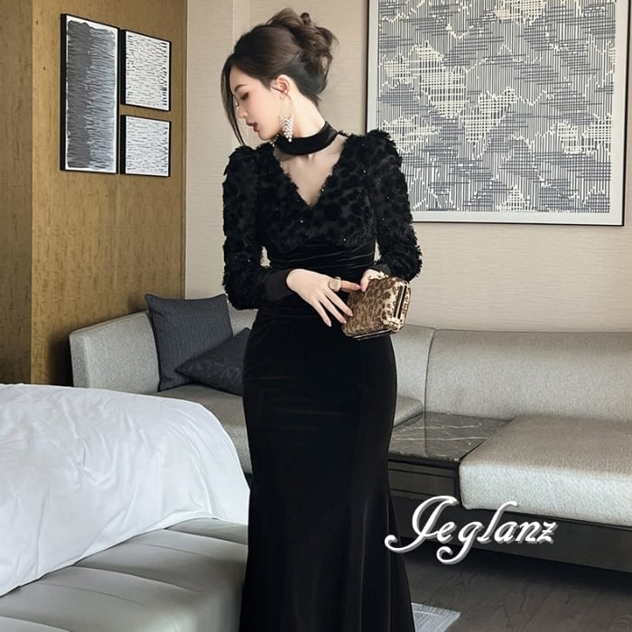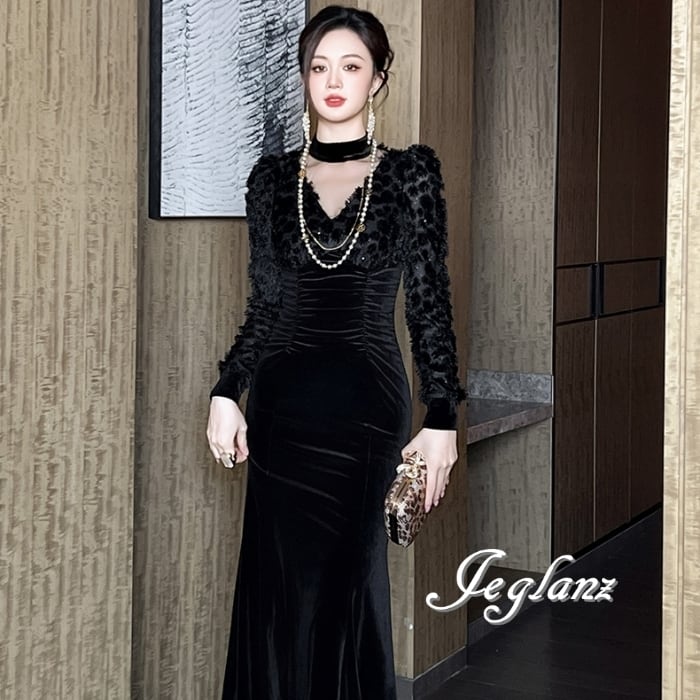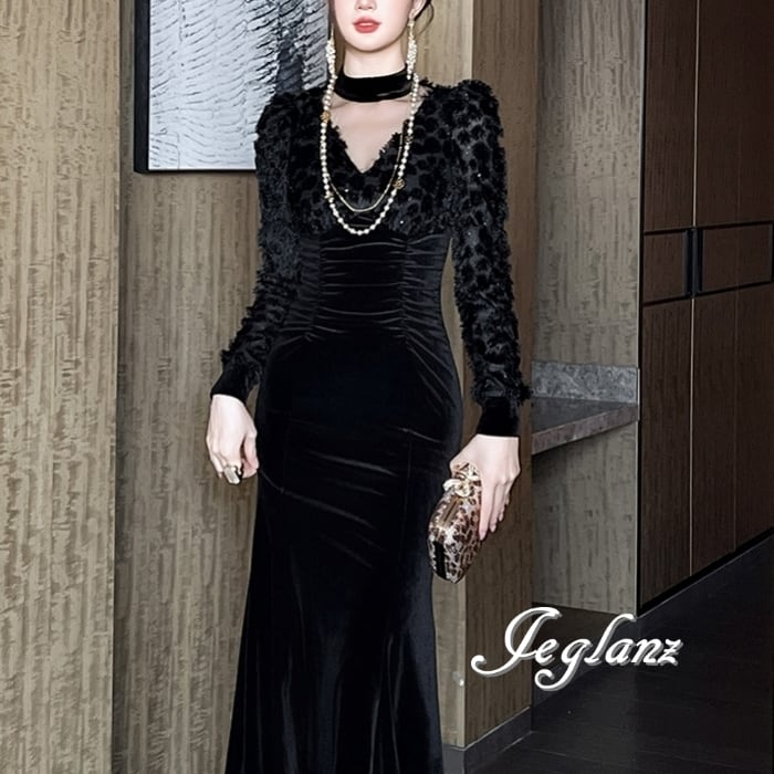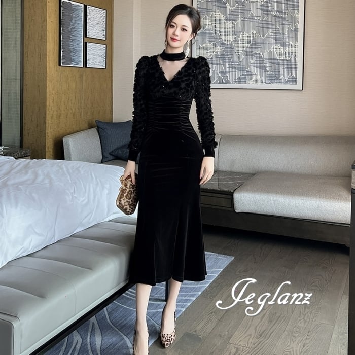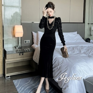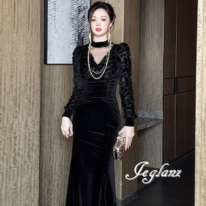 ベルベット調 ワンピース ドレス 刺繍 レース ギャザー 光沢感 ♪(MB462)★ η☆