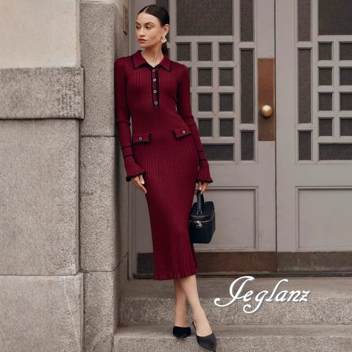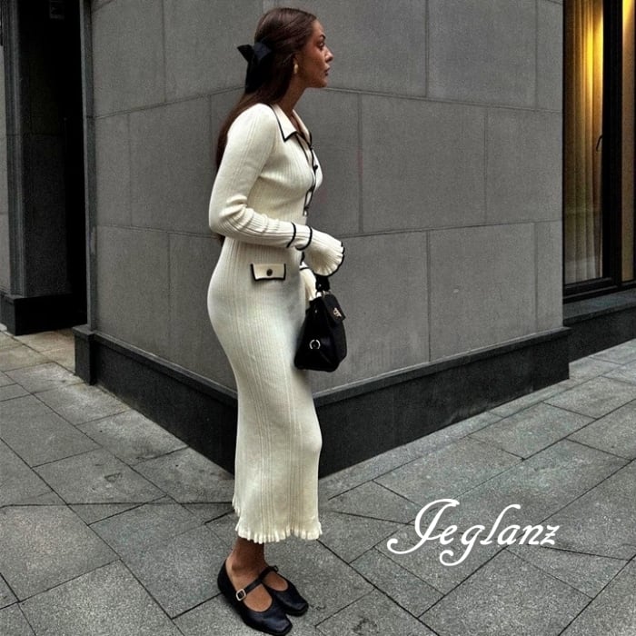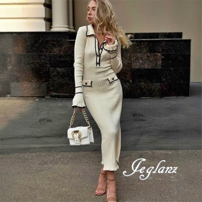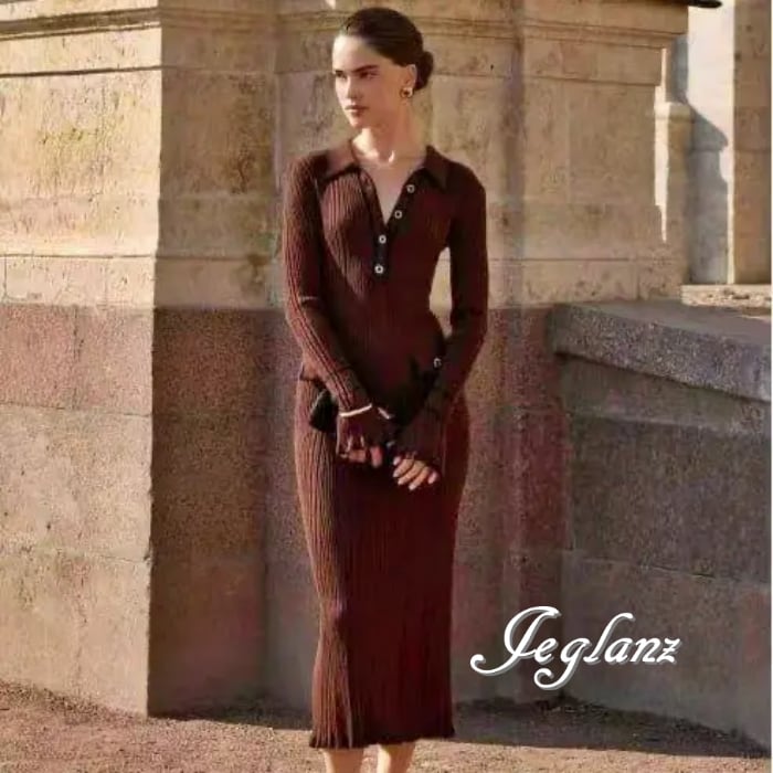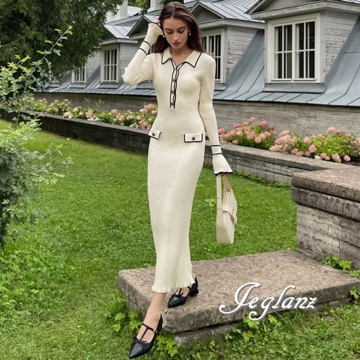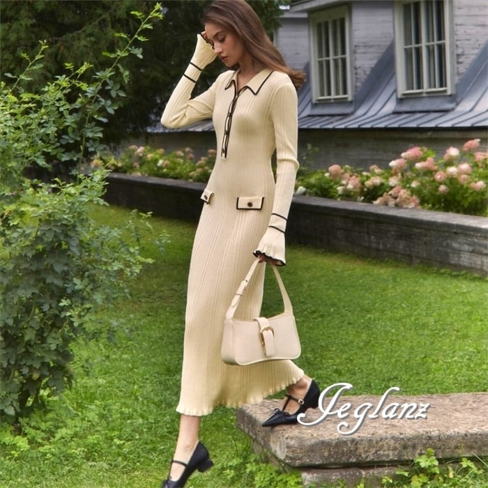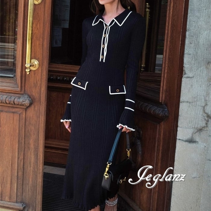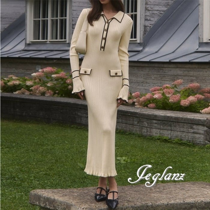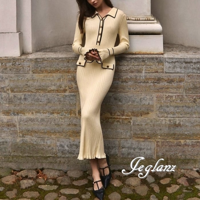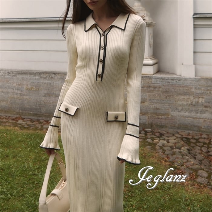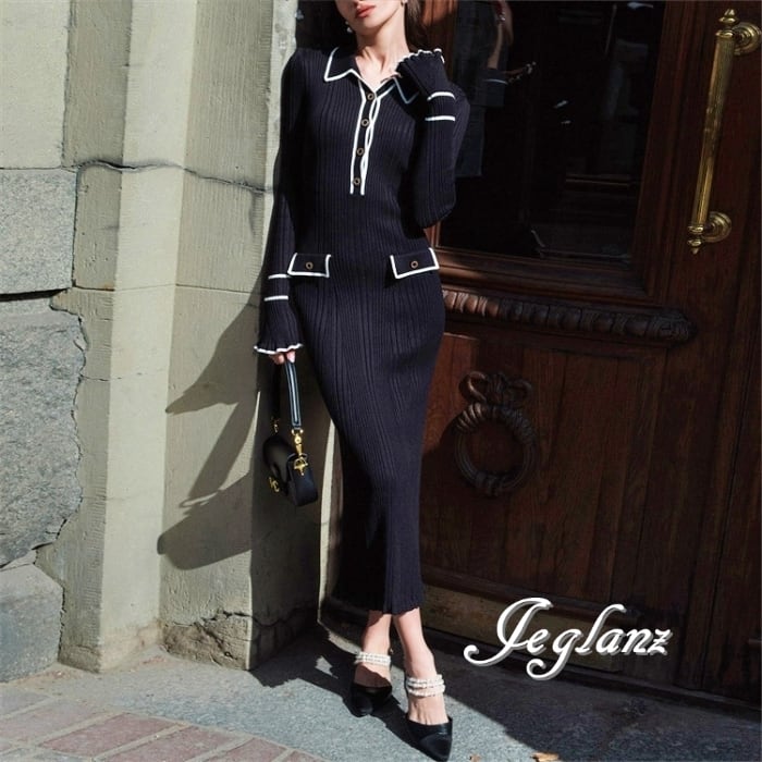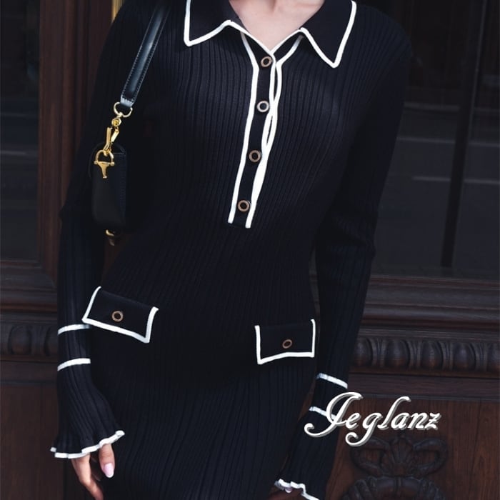 4色 バイカラー ニット ワンピース 襟付き スリム レトロ感 (MB485)γ