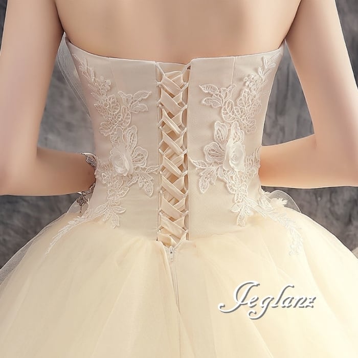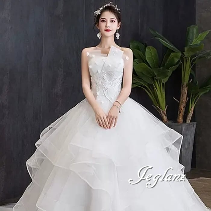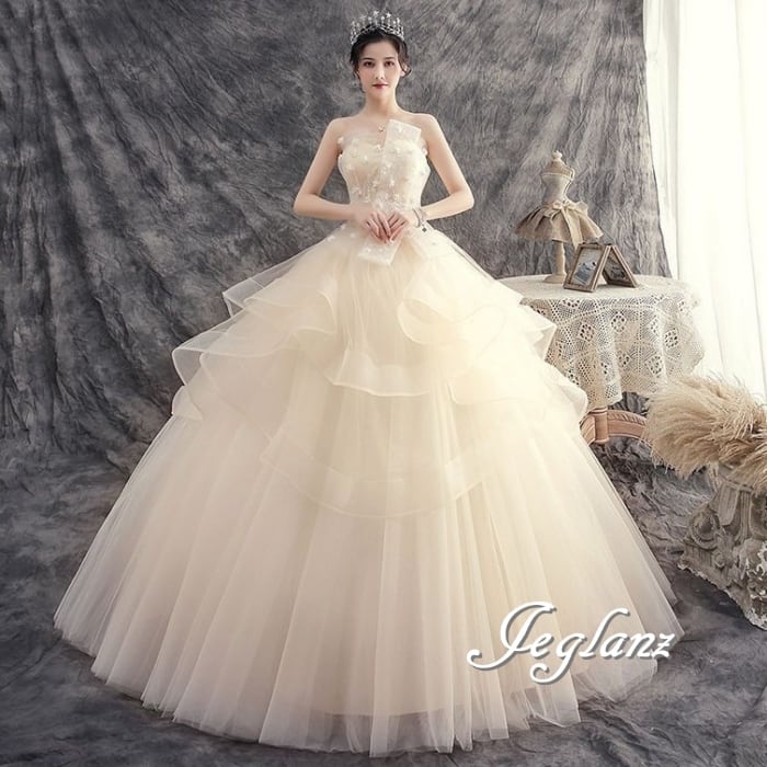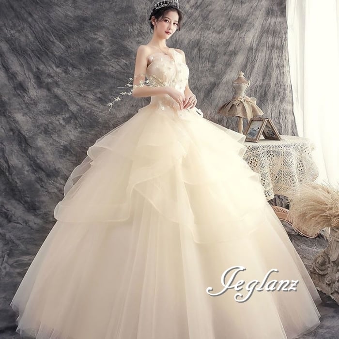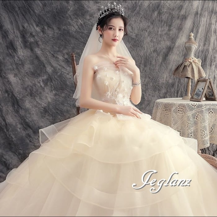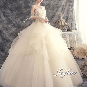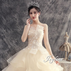 華やか ウエディングドレス ベアトップ 編み上げ レイヤード ♪(MB492)ο☆