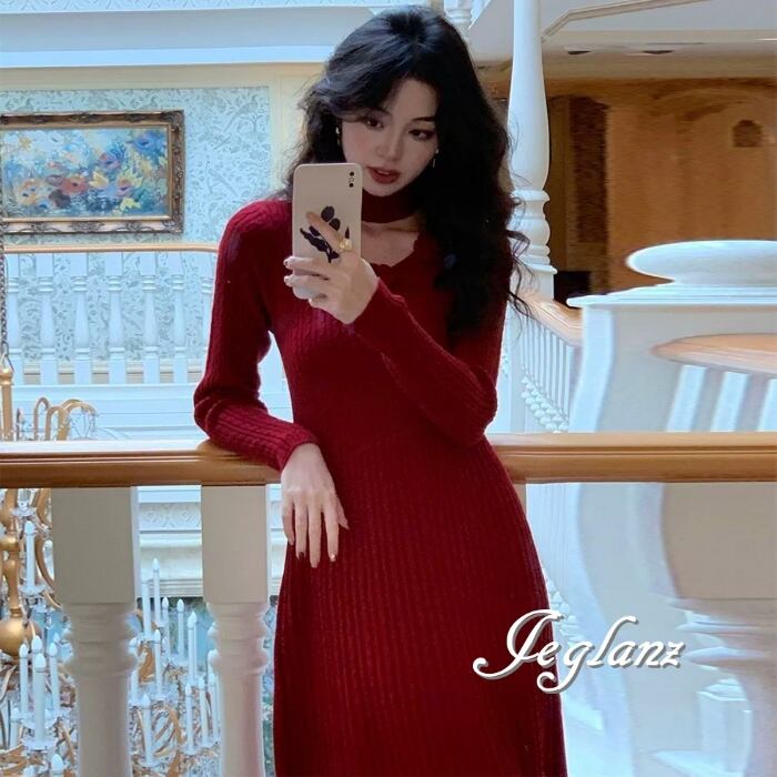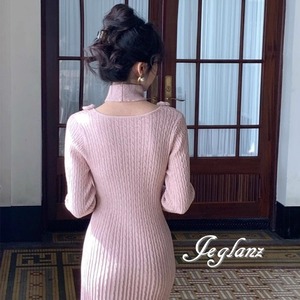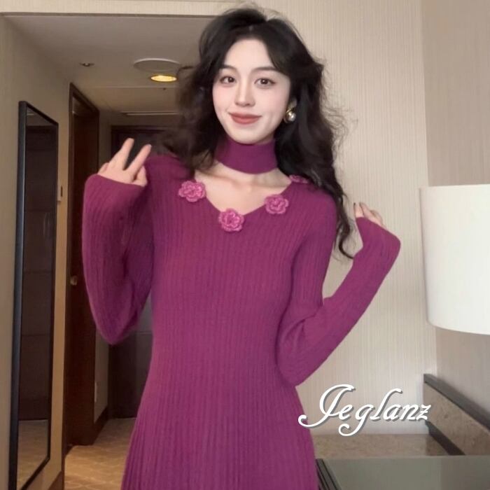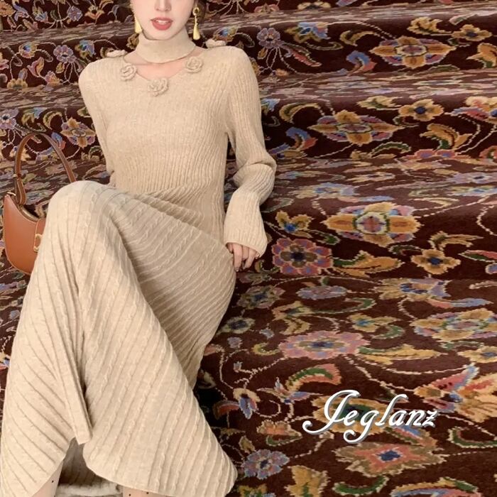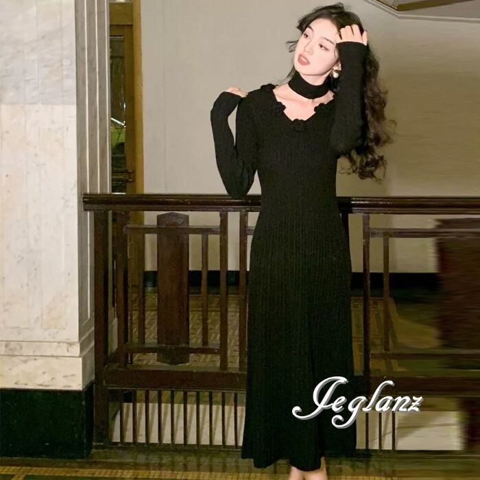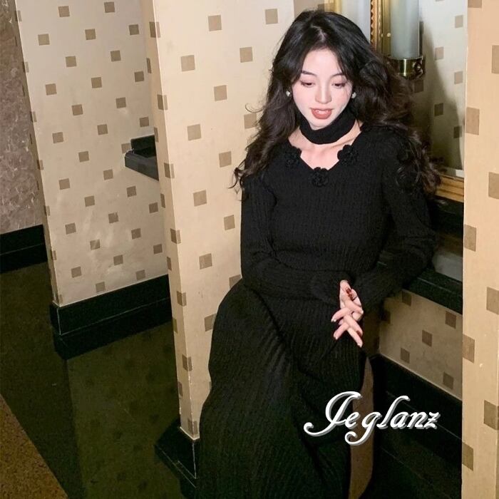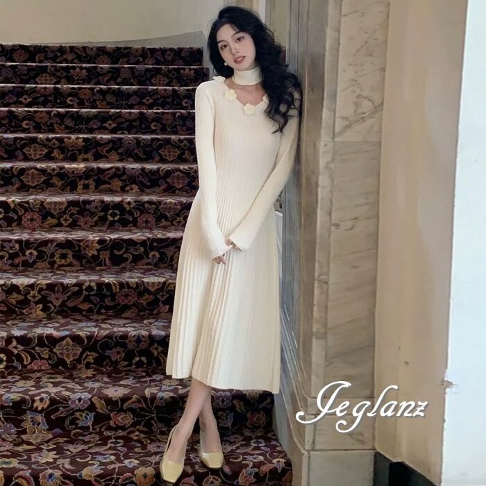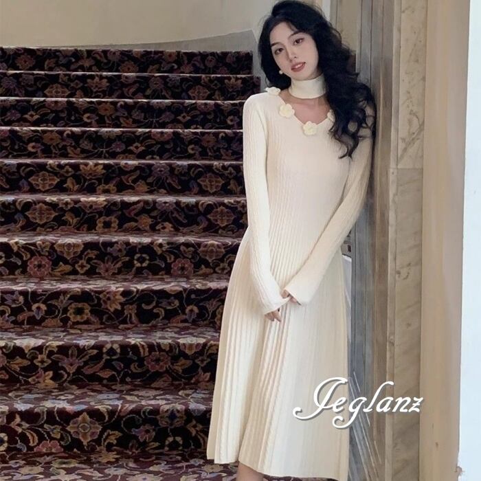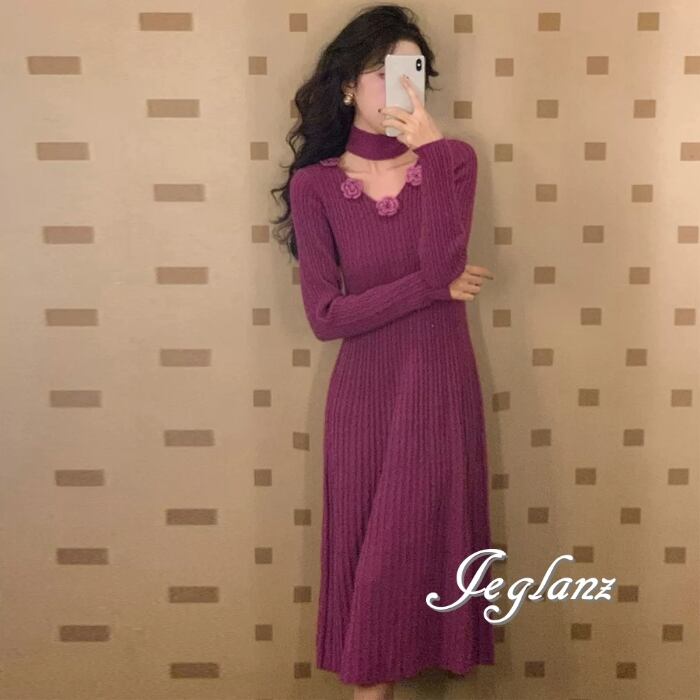 5色 ニット ワンピース 立体フラワー チョーカー付き (MB524)γ