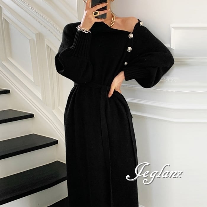3色 ニット ワンピース ゴールドボタン 共ベルト 襟 2way (MB525)γ