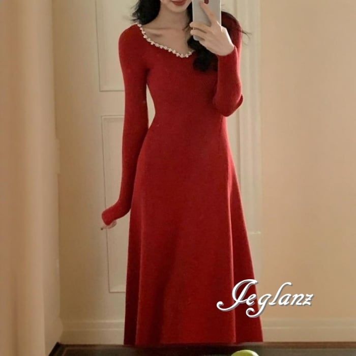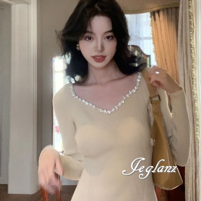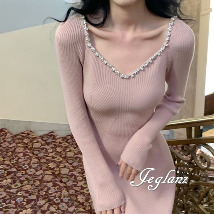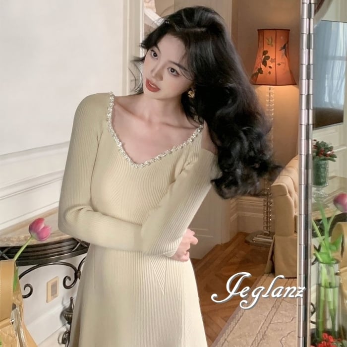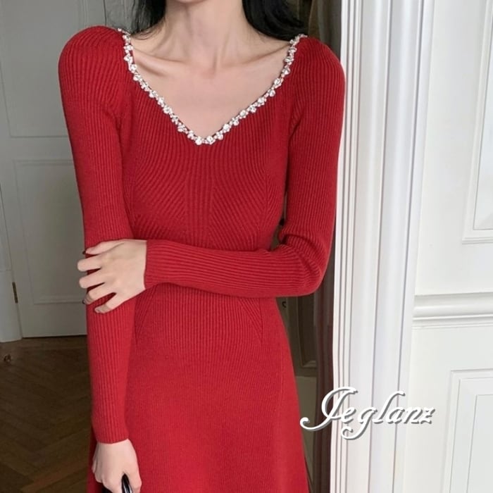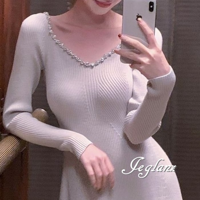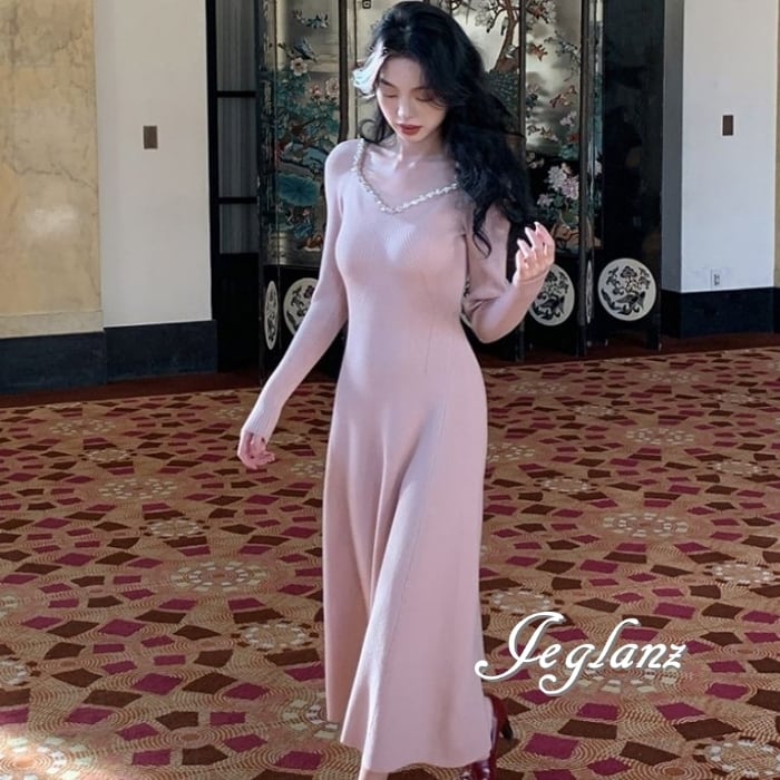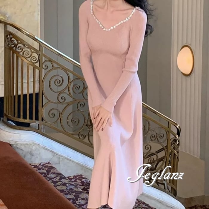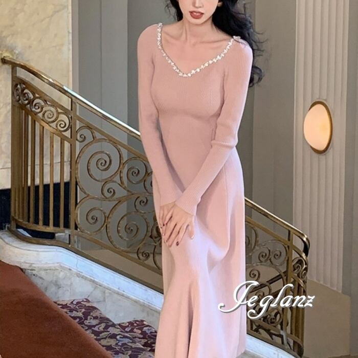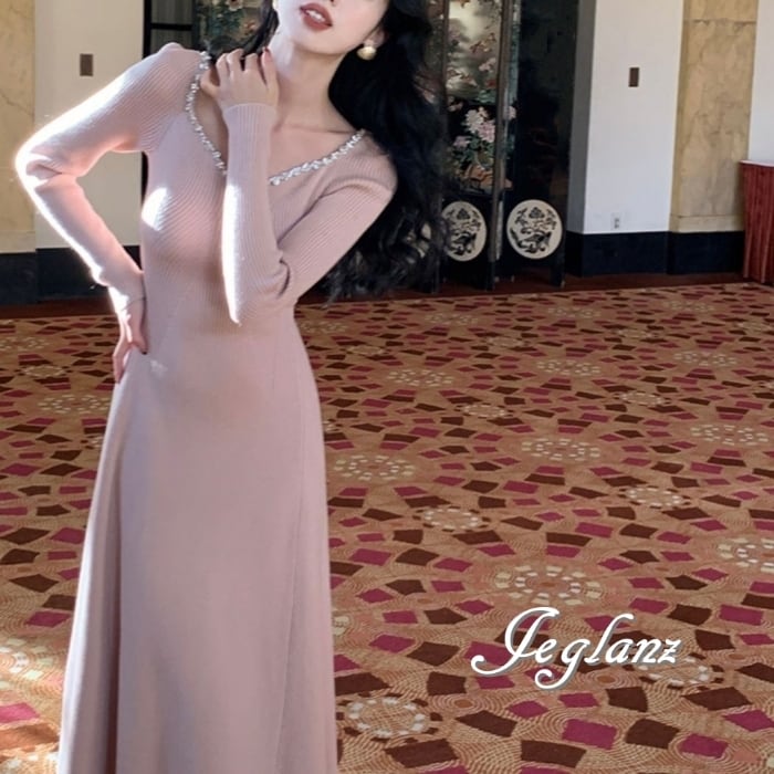 4色 ビジュー付き ニット マキシ ワンピース 背中開き エレガント(MB576)δ
