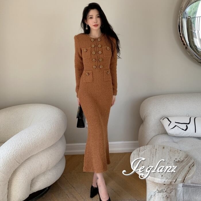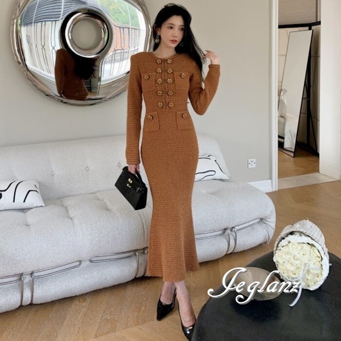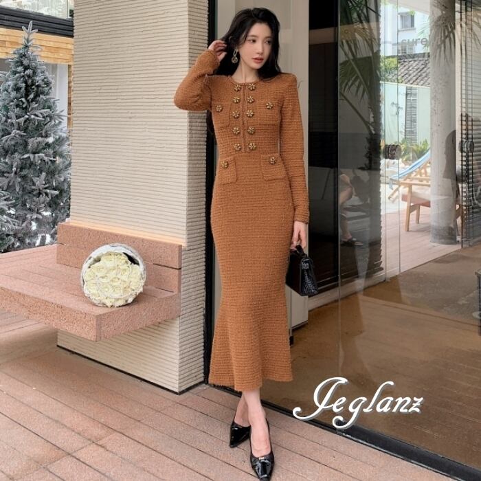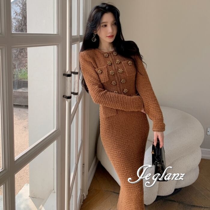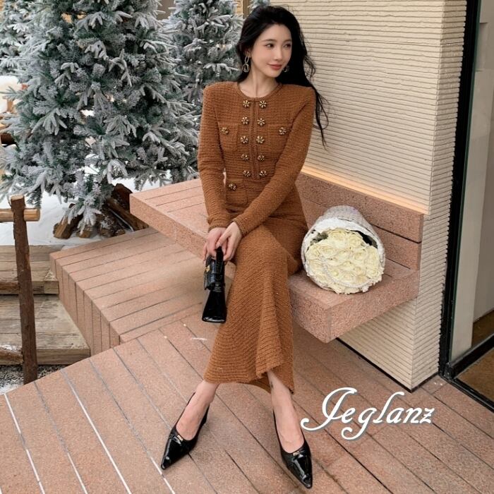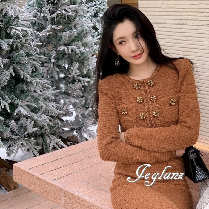 上品 ツイード ニット ワンピース ビジュー ボタン ファンシー(MB581)η
