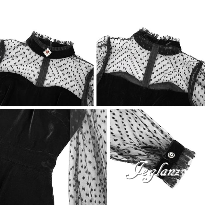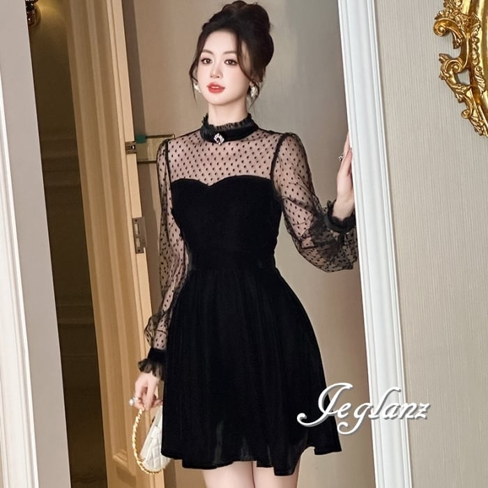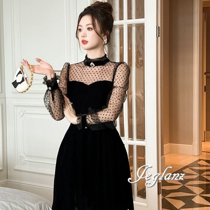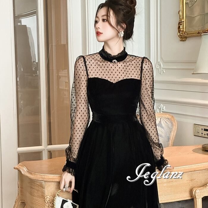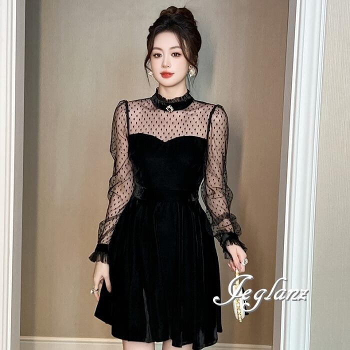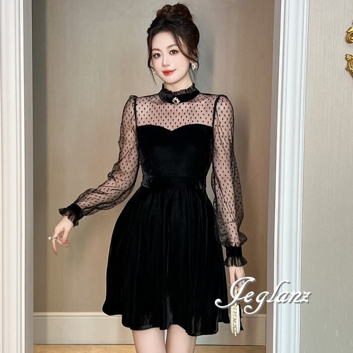 ベロア調 ワンピース ブラック ドレス 水玉 ドット ミニスカ(MB583)η