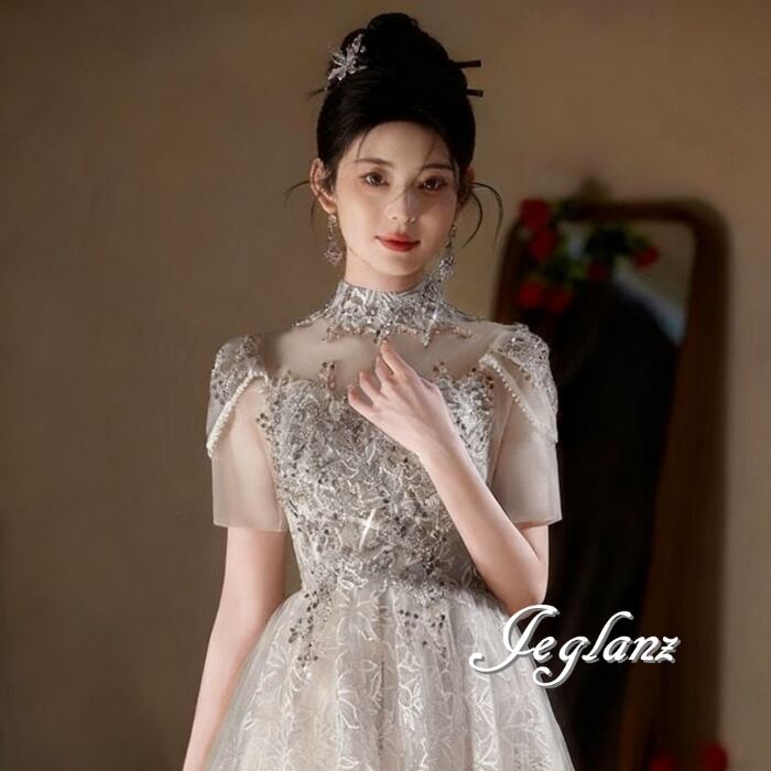 パーティ 半袖 イブニングドレス 編み上げ ビジュー 光沢感 2色(MB635)ζ☆