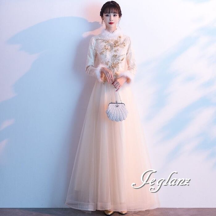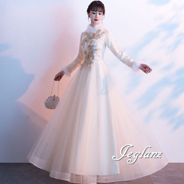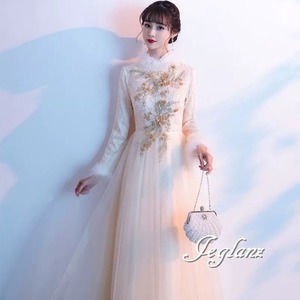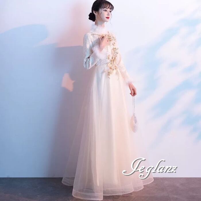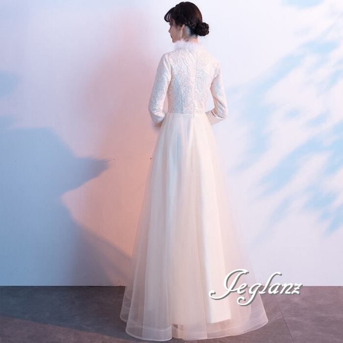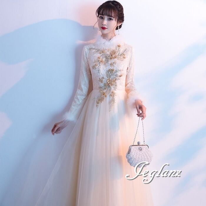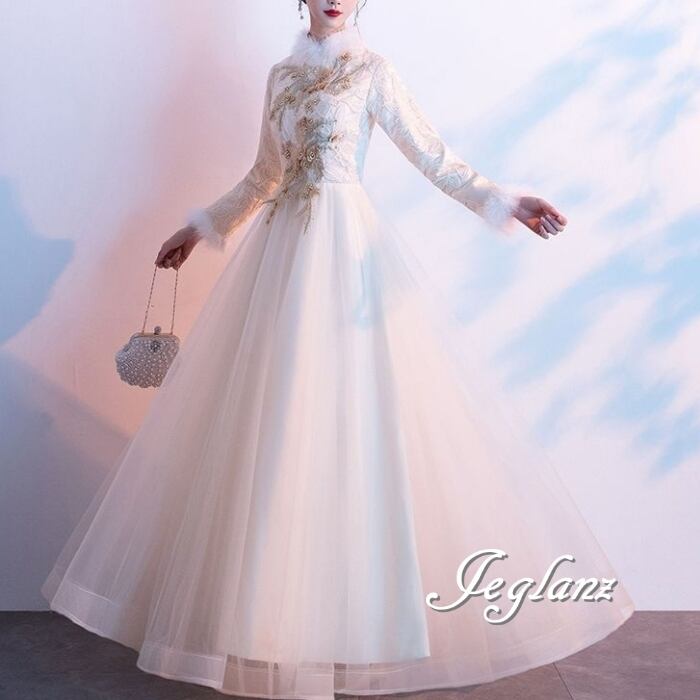 パーティ イブニング 長袖 フェザードレス 刺繍 レース チュール(MB655)ζ☆