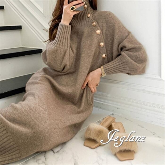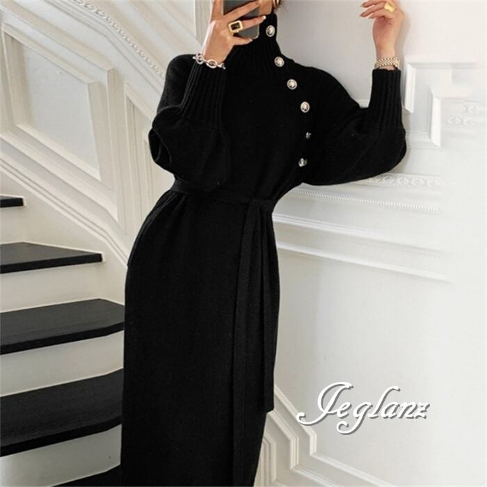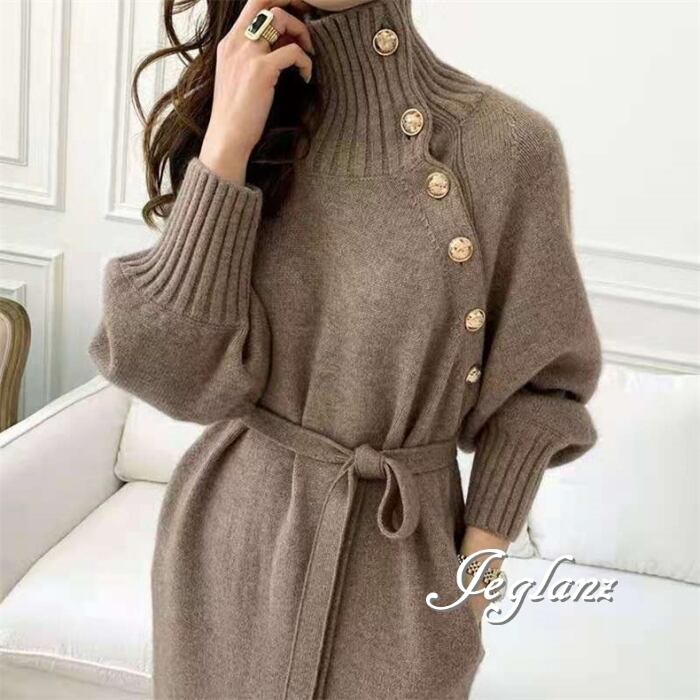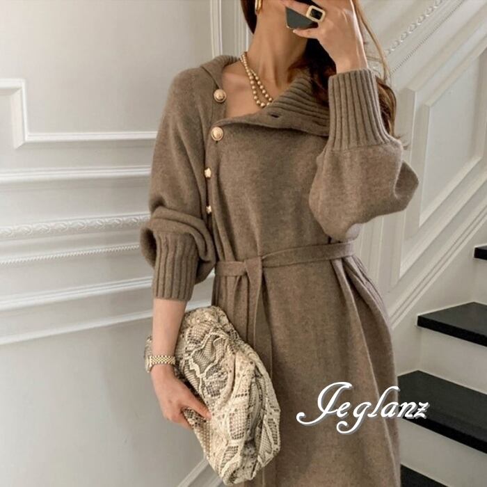 3色 ニット ワンピース 長袖 ゴールドボタン 共ベルト 襟 2way(MB662)γ☆