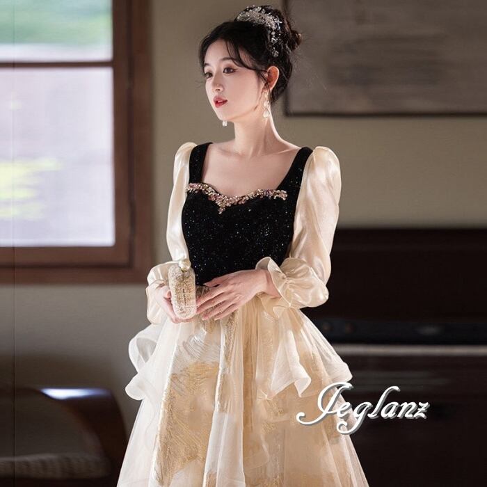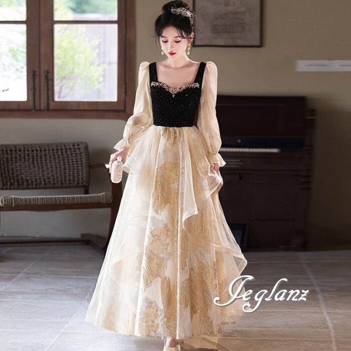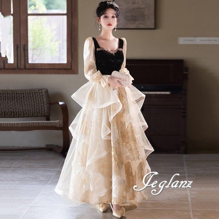 パーティ イブニングドレス 長袖 レイヤード チュール ビジュー(MB673)ζ☆