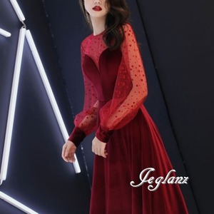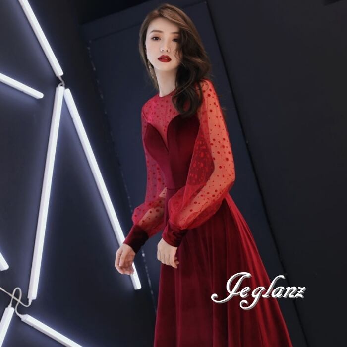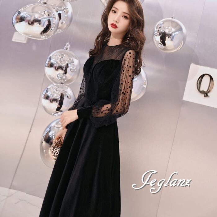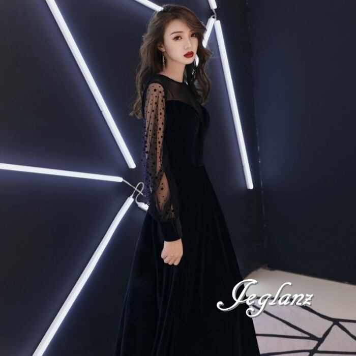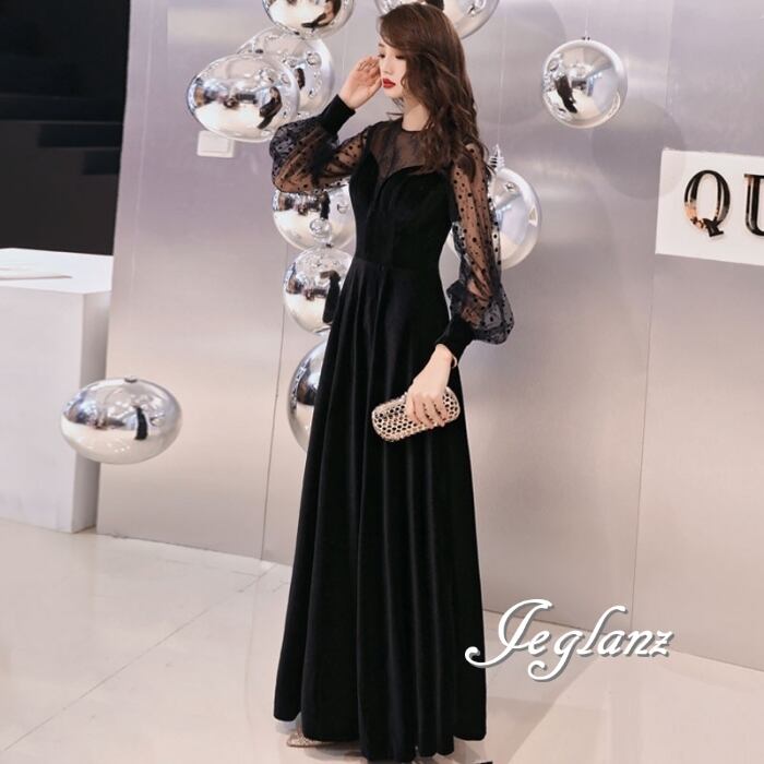 2色 イブニングドレス 長袖 ブラック ドレス 水玉 ドット シアー(MB684)ζ☆