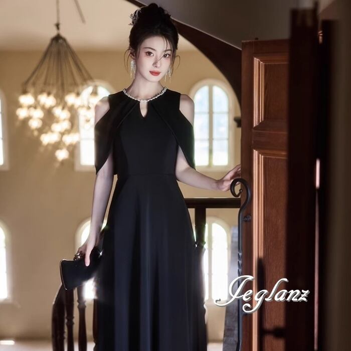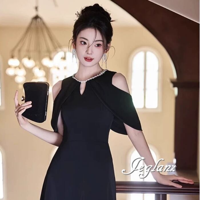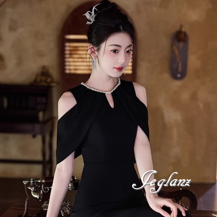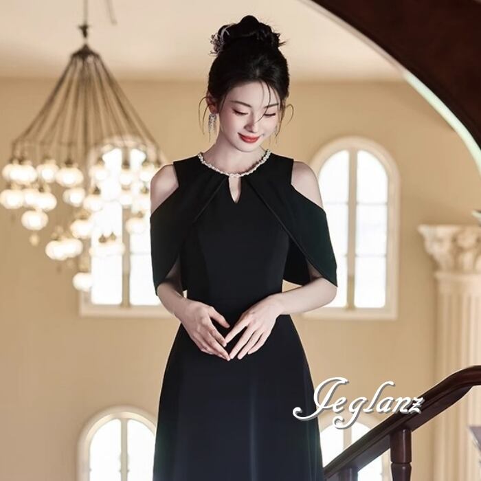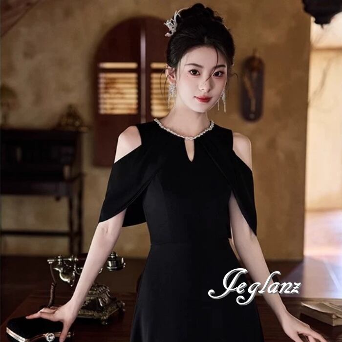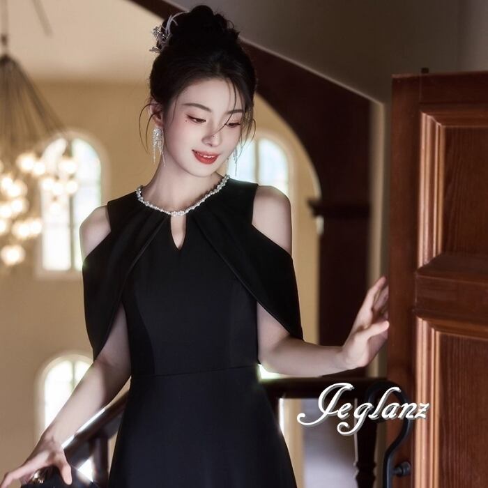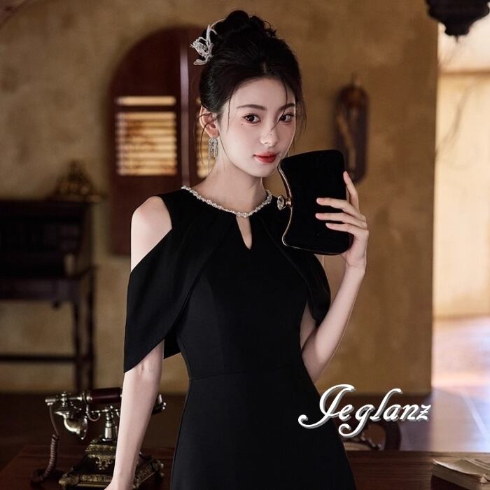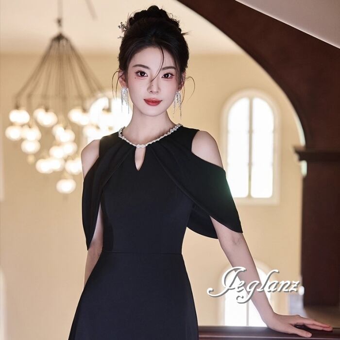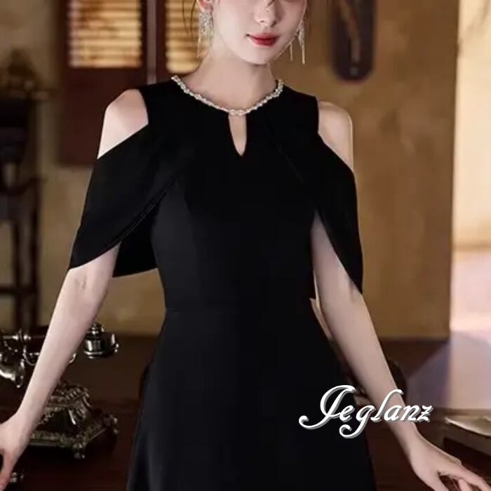 ビジュー イブニングドレス オープンショルダー ブラックドレス(MB713)ζ☆