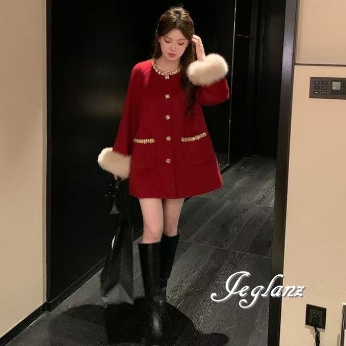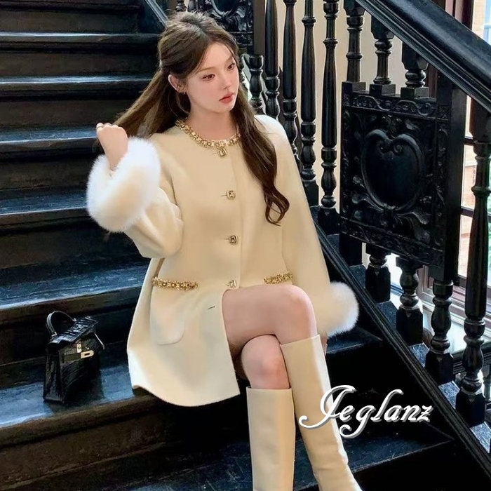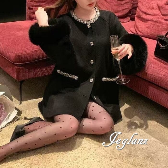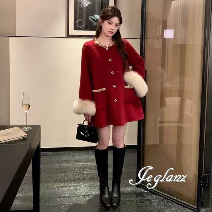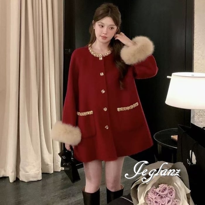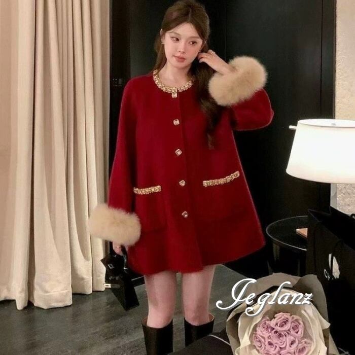 3色 ビジュー付き ニット コート ボリュームファー ファンシー(MB732)τ
