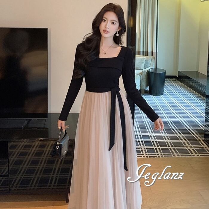 パーティ ドレス 長袖 マキシ丈 ワンピース バイカラー 共ベルト(MB772)ζ☆