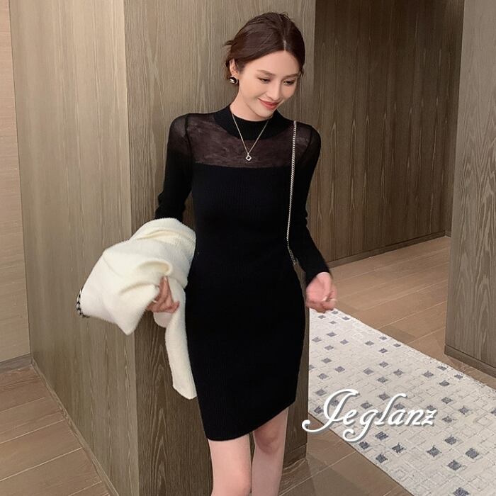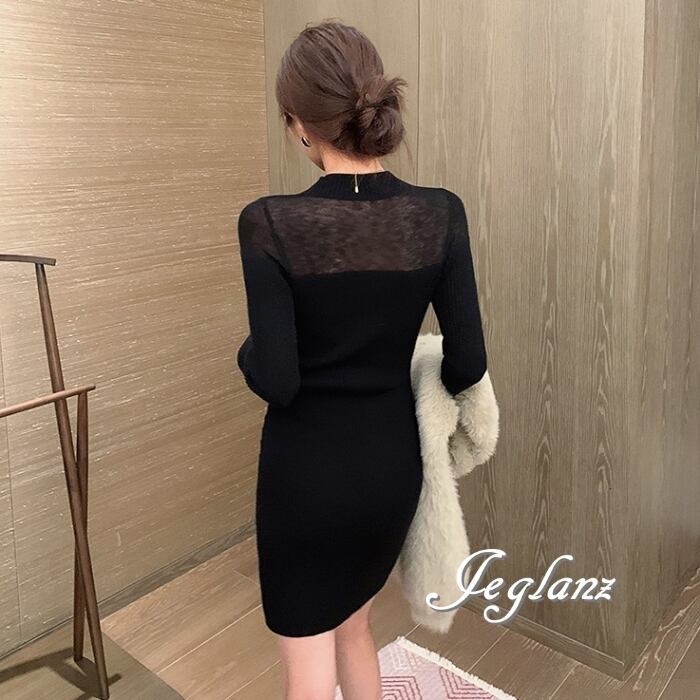 ニット 長袖 ワンピース ハイネック シアー感 タイト ミニスカ(MB773)ι