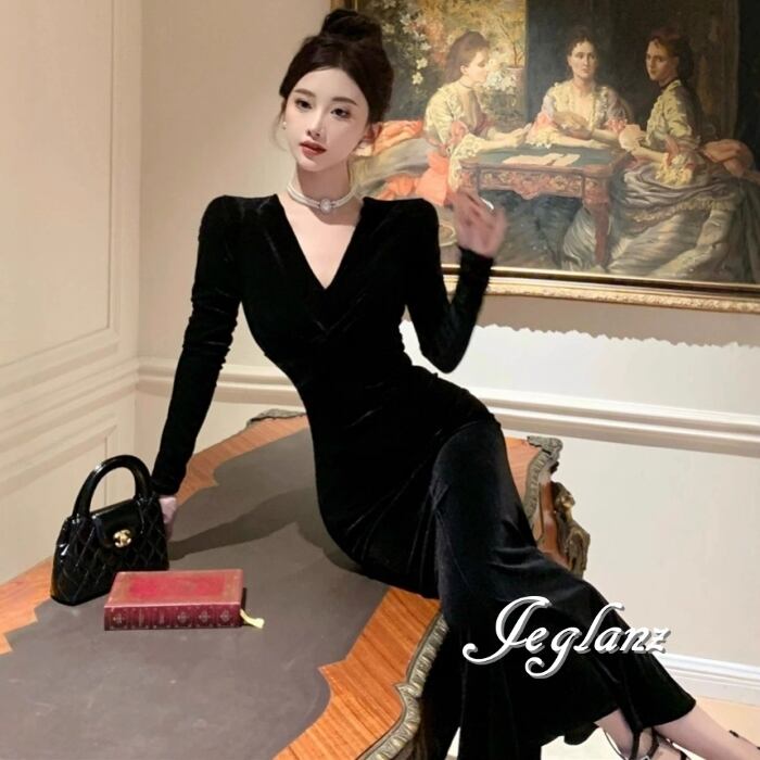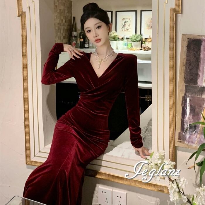 パーティ ベルベット調 ワンピ 長袖 きれいめ シンプル派 2色(MB793)ζ
