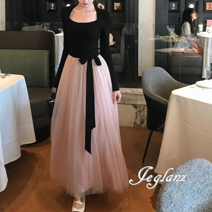 2色 パーティ ドレス 長袖 マキシ丈 ワンピ バイカラー 共ベルト(MB794)ζ☆