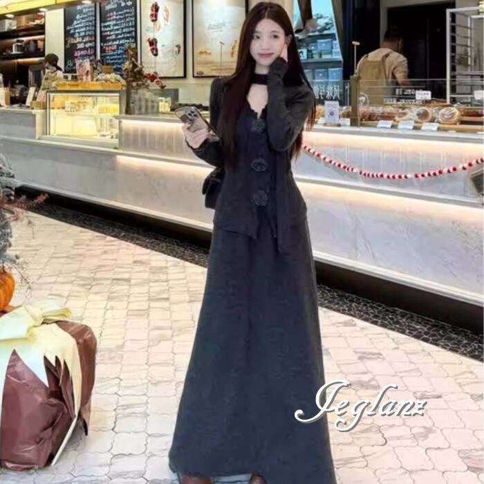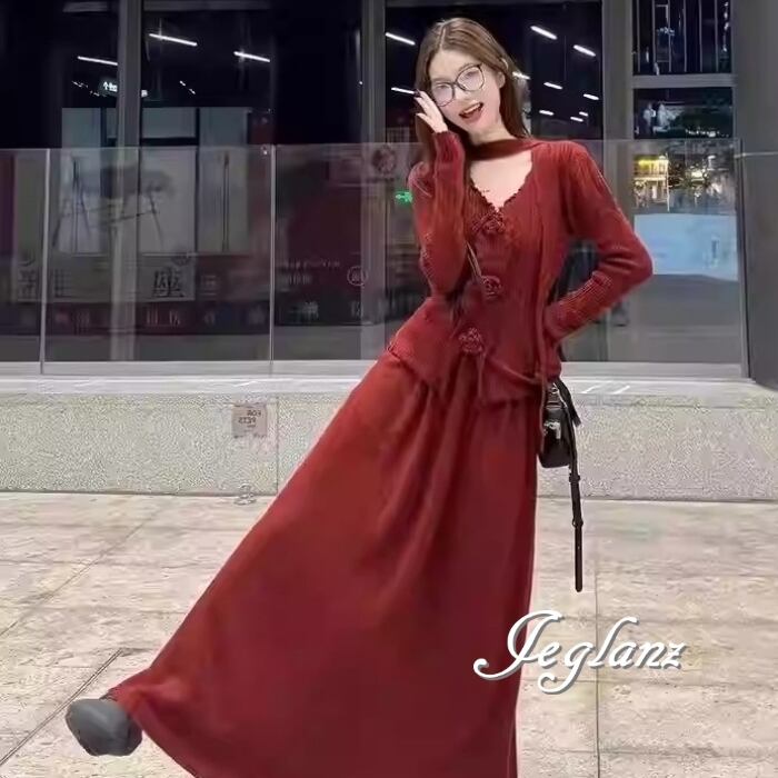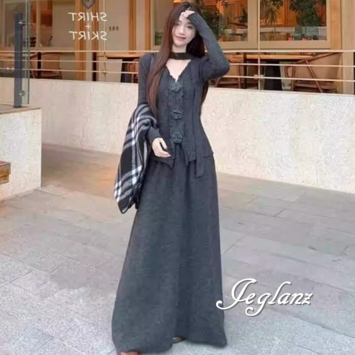 2点セット ニット 長袖 トップス 共ベルト マキシ スカート 3色(MB812)λι