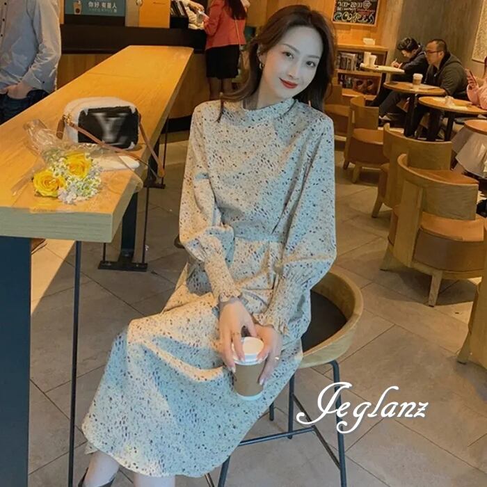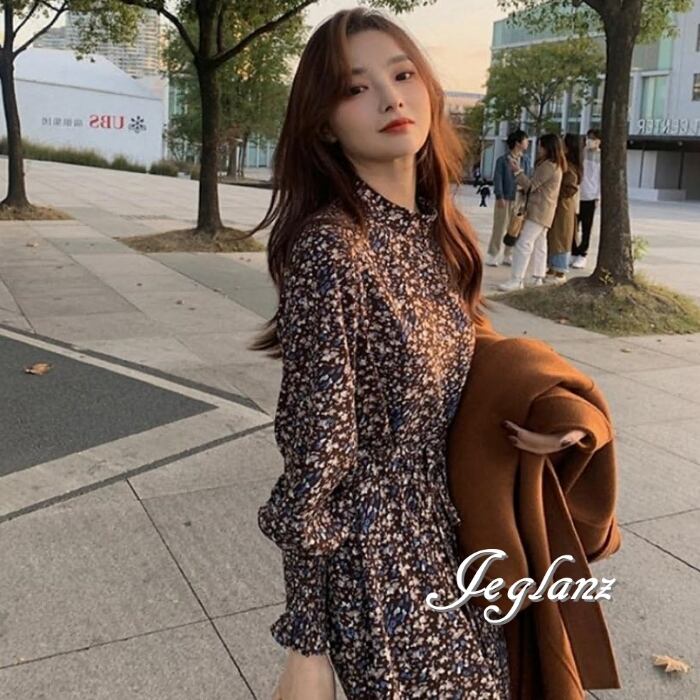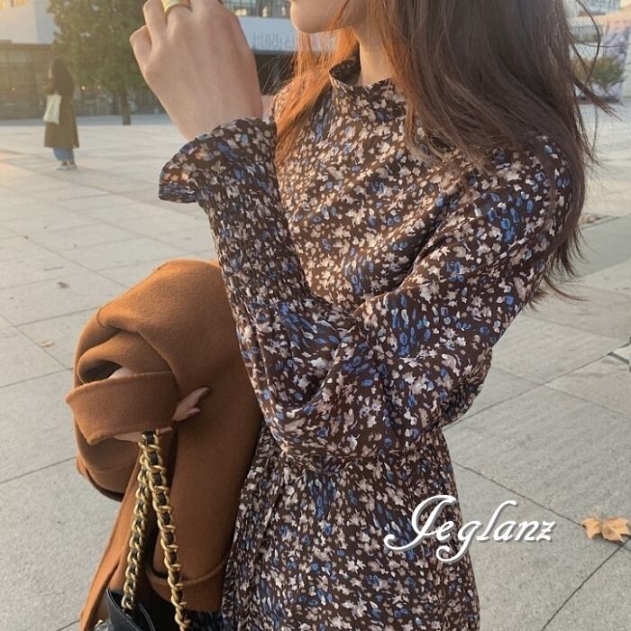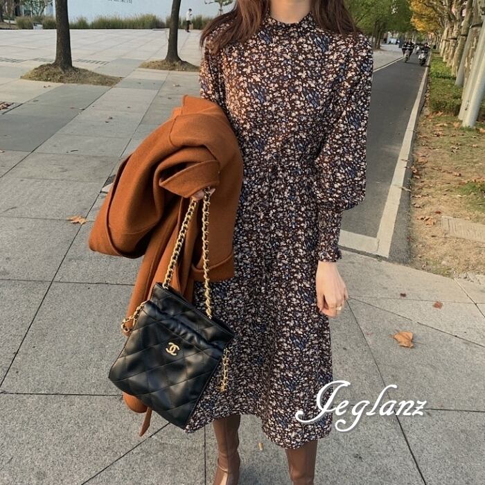 2色 プリント 長袖 ワンピース ハイネック ギャザー 紐ベルト ♪(MB833)γα