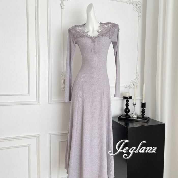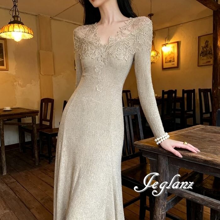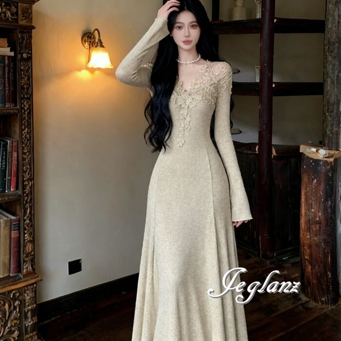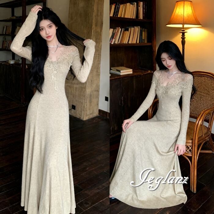 3色 刺繍 レース ニット マキシ ワンピース 長袖 ドレス エレ派(MB835)ζ☆