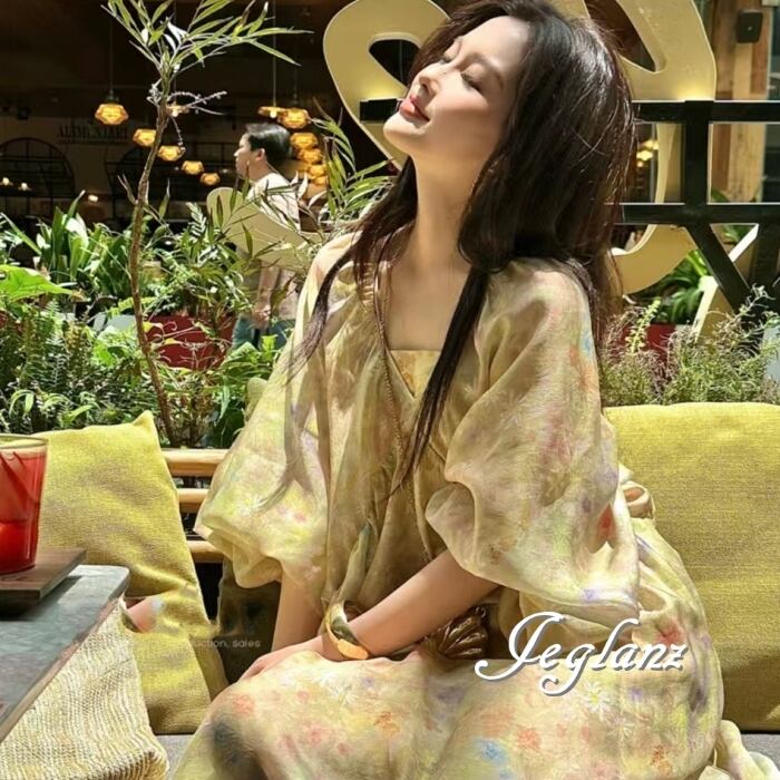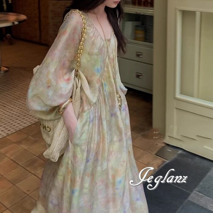 プリント ワンピース ボリューム袖 ルーズフィット 7分袖 韓国(MB841)ζ☆