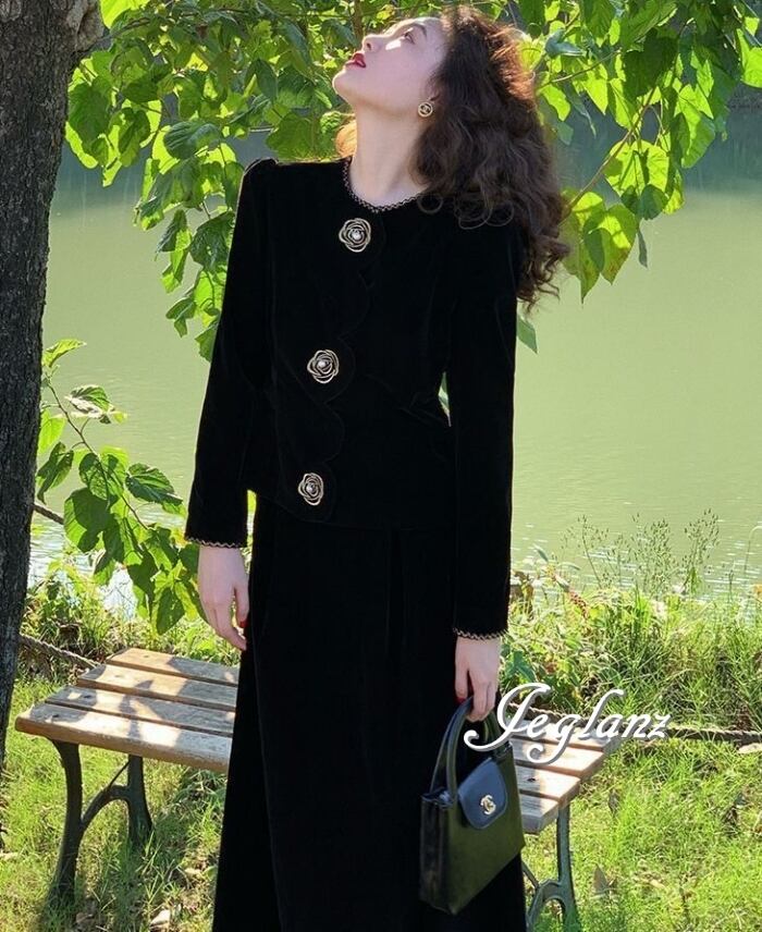 セットアップ 2点 ベルベット調 ジャケット 花 ボタン スカート(MB842) μ