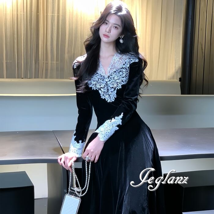 バイカラー ベロア調 ワンピース 長袖 ドレス 刺繍 レース 光沢(MB844)δ