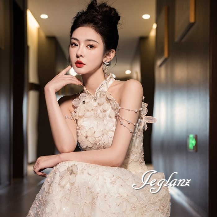 パーティ イブニングドレス 立体フラワー パール スタンドカラー(MB932)ζ☆