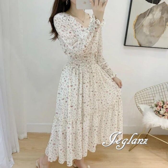 3色 ボタニカル柄 ギャザー ワンピース 長袖 ドレス フェミニン (MB983)γα☆