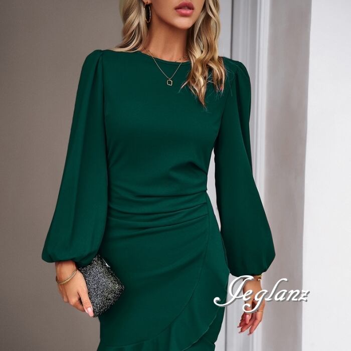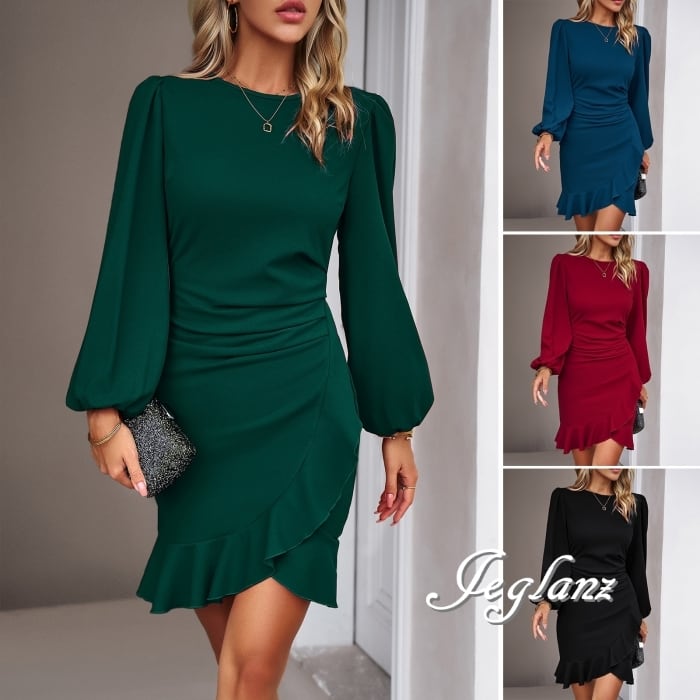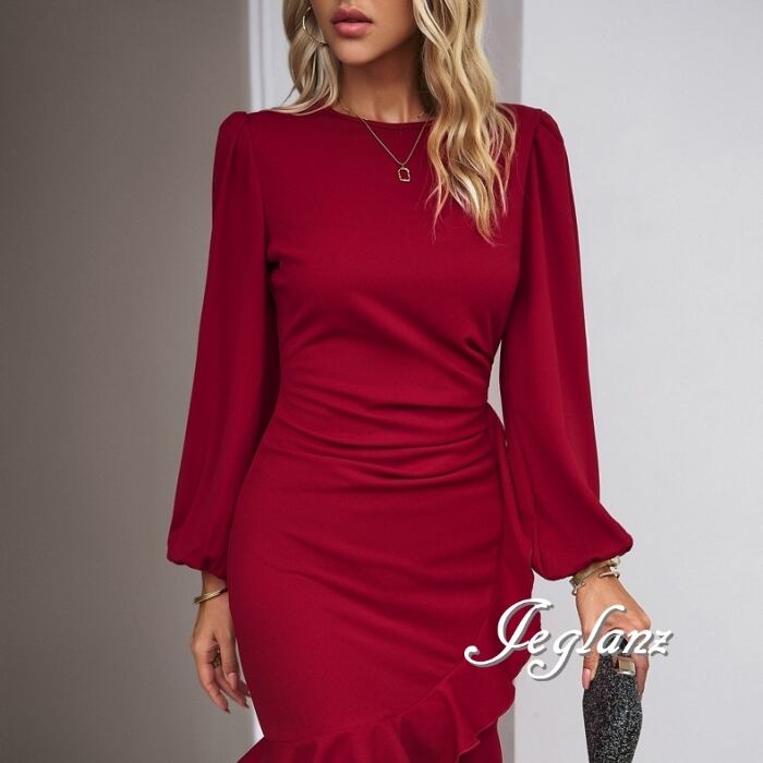4色 パーティ 長袖 ワンピース ドレス 裾フリル ひざ上 きれいめ( MA994)ζ
