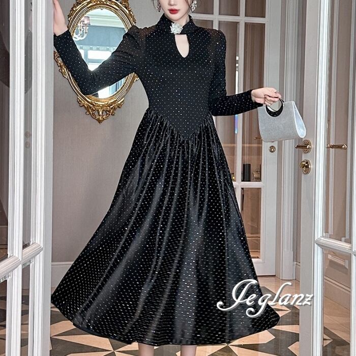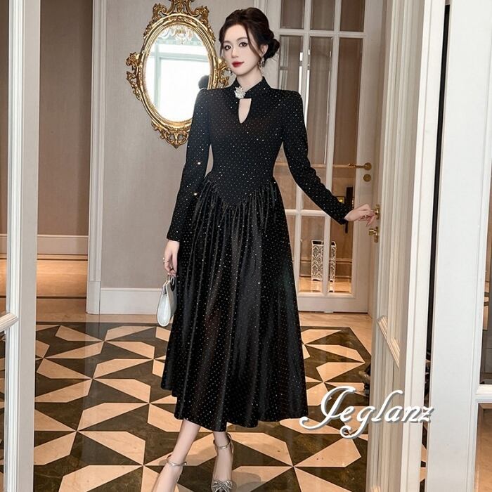 パーティ ドレス 長袖 ワンピース ベロア調 ラインストーン 光沢(MC001)ζ☆