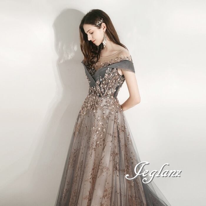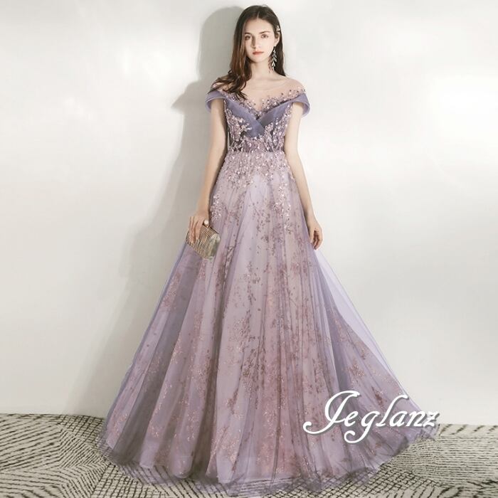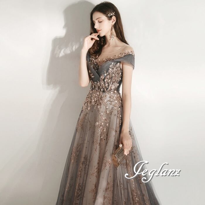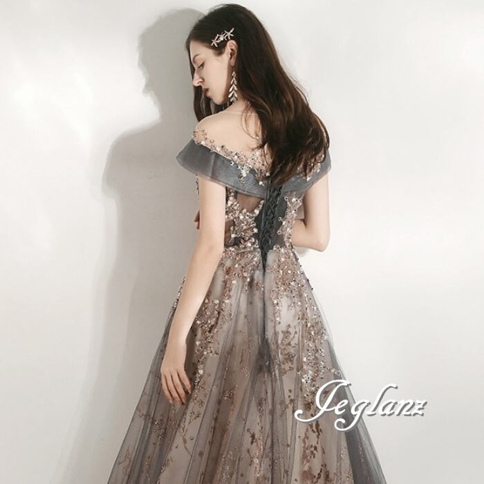 パーティ 半袖 イブニングドレス 背中 編み上げ チュール 4色 ♪ (O8174)ζ☆