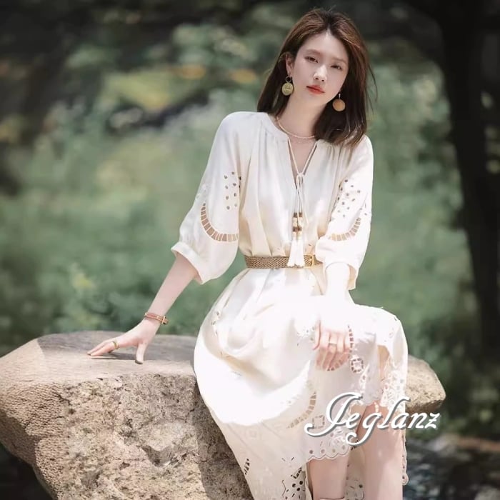 エスニック デザイン ワンピ タッセル パンチングレース 7分袖 (MC024)ζ☆