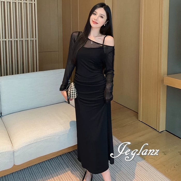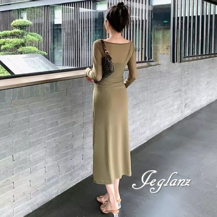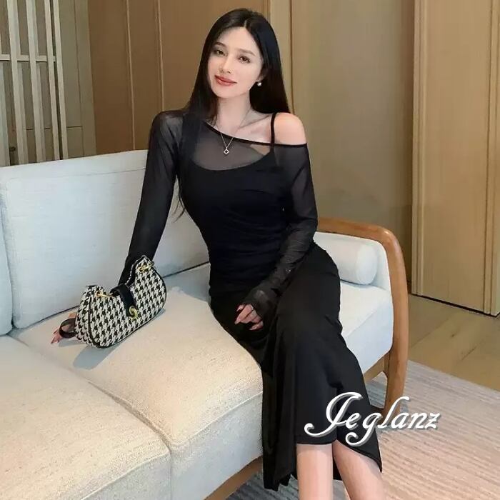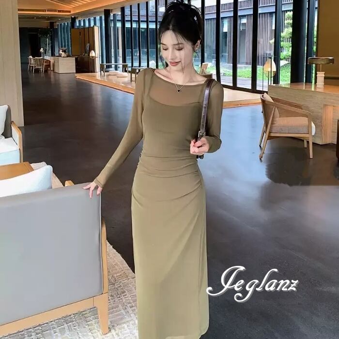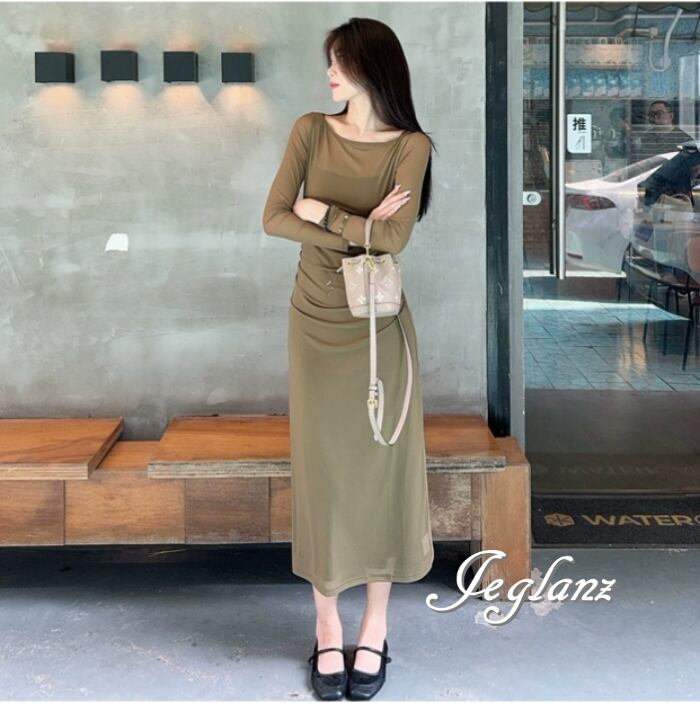 セットアップ 2点 長袖 シアー ワンピース キャミワンピ 2色 ♪(MC042)ζ