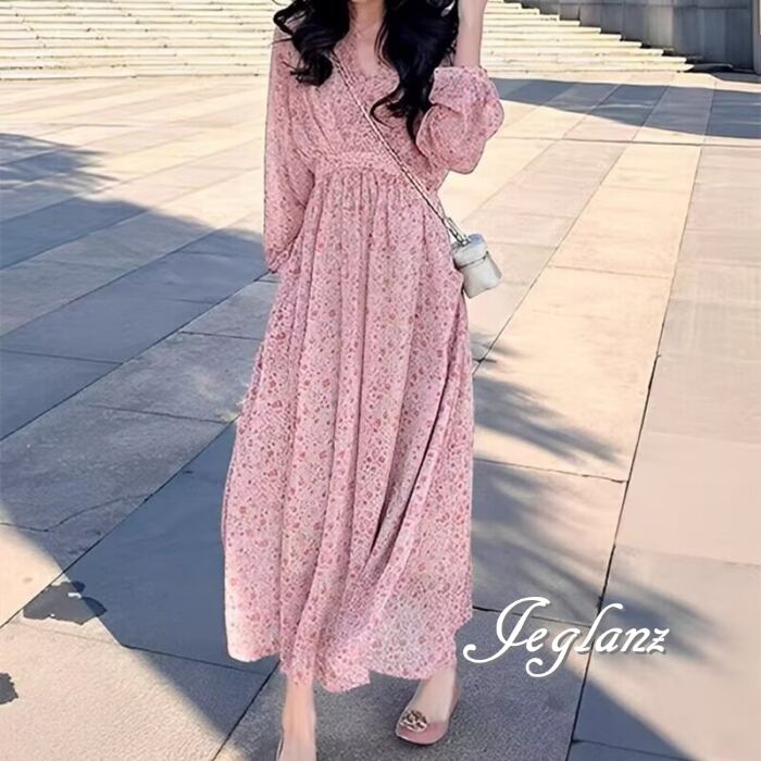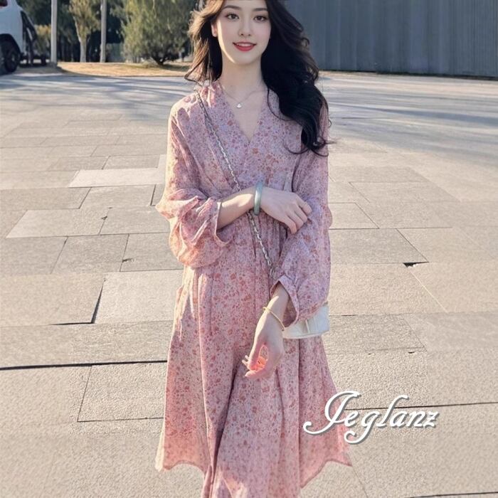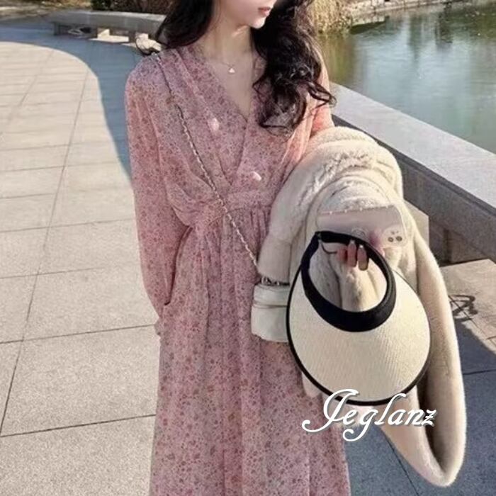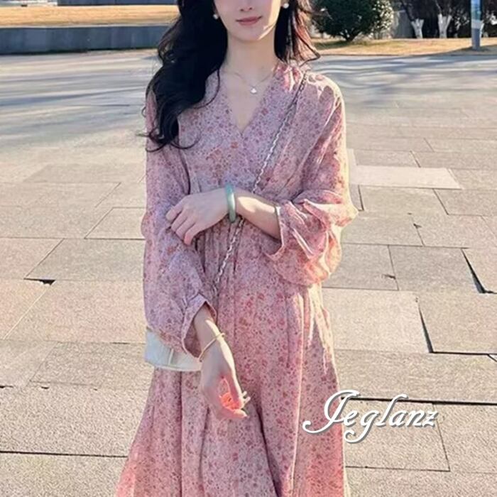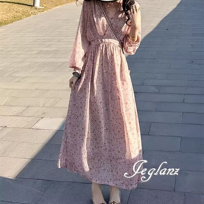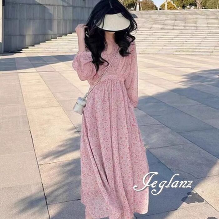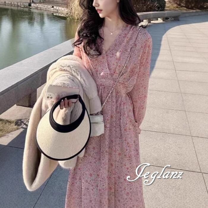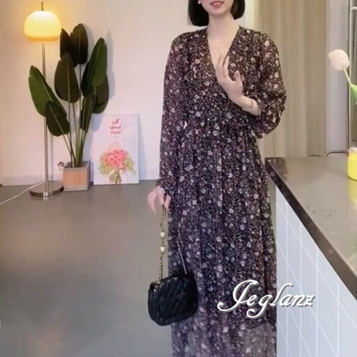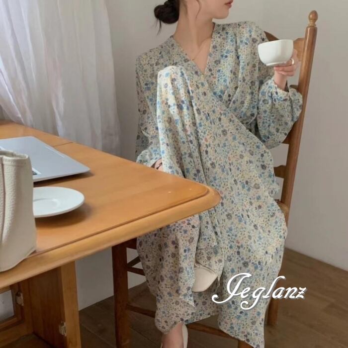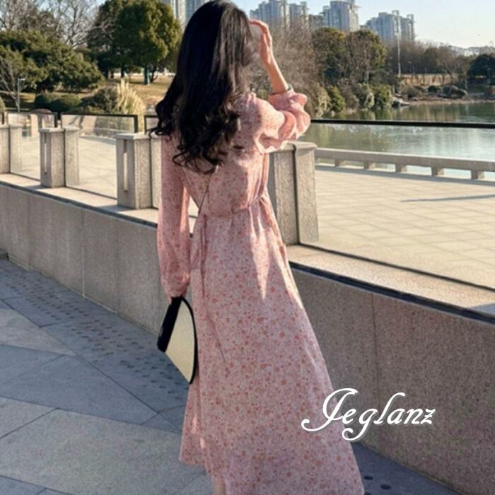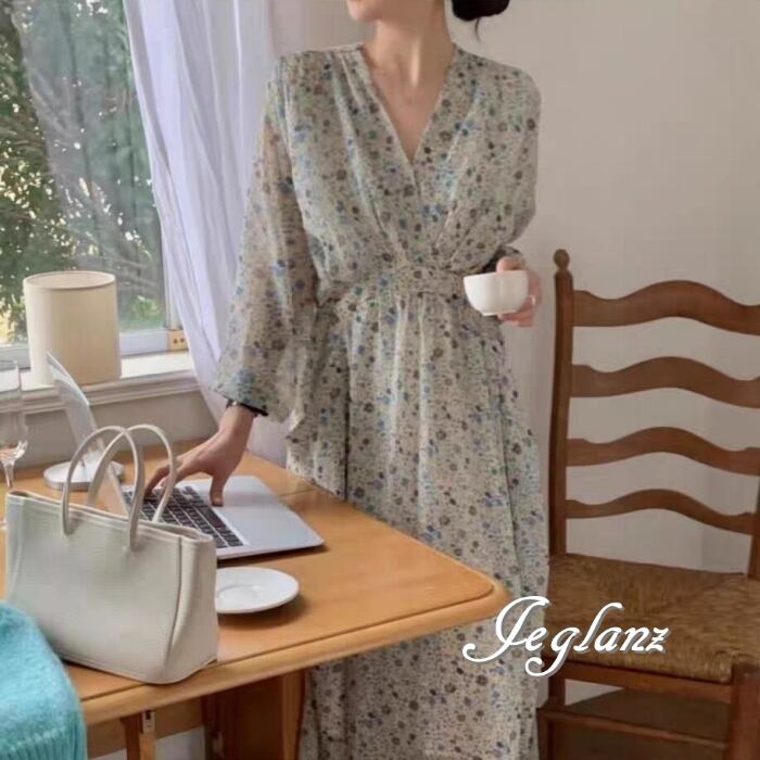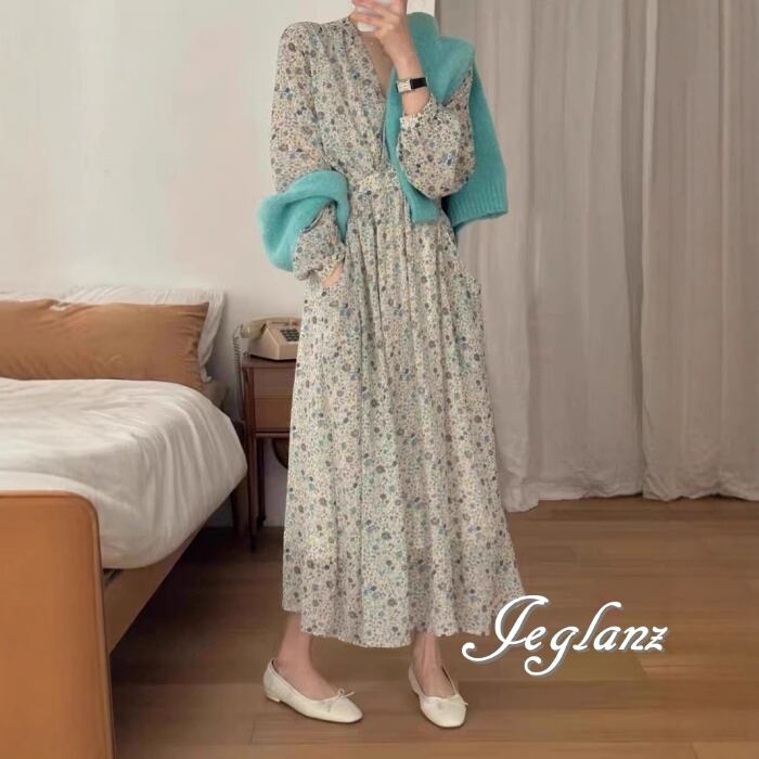 3色 小花柄 ワンピース 長袖 Vネック きれいめ カジュアル派 ♪( MC065)ζ☆